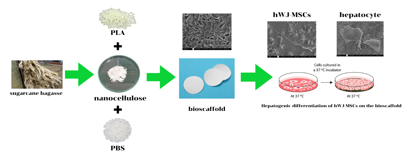 Composite materials with tailored properties are increasingly sought after for tissue engineering applications. The aim of this work was to fabricate a nanocellulose-based biopolymer scaffold that was specifically designed for liver tissue engineering. Nanocellulose was extracted from natural sugarcane bagasse, which involved a synergistic approach that combined high-pressure homogenization (30,000 psi, 15 cycles) and enzymatic digestion (enzyme concentration: 7 %). The resulting nanocellulose exhibited an average size of 278.9 nm, a polydispersity index (PDI) of 0.752, and a crystallinity index of 50 %. This optimized nanocellulose was blended with biopolymers, polylactic acid (PLA), and polybutylene succinate (PBS) for scaffold production using film casting technique. The composite material proportions were optimized using response surface methodology (RSM), which led to an optimal composition of 65.00 wt% PLA, 26.81 wt% PBS, and 8.19 wt% nanocellulose. In vitro cytotoxicity evaluation of the optimized scaffold revealed a high average cell viability of 96.65 %. Human Wharton’s jelly (hWJ) mesenchymal stem cells (MSCs) were seeded onto the scaffold and exhibited the potential to differentiate towards a hepatocyte lineage for 17 days. This work could be a significant initial step towards the development of novel nanocellulose-based scaffolds for applications in liver tissue engineering.