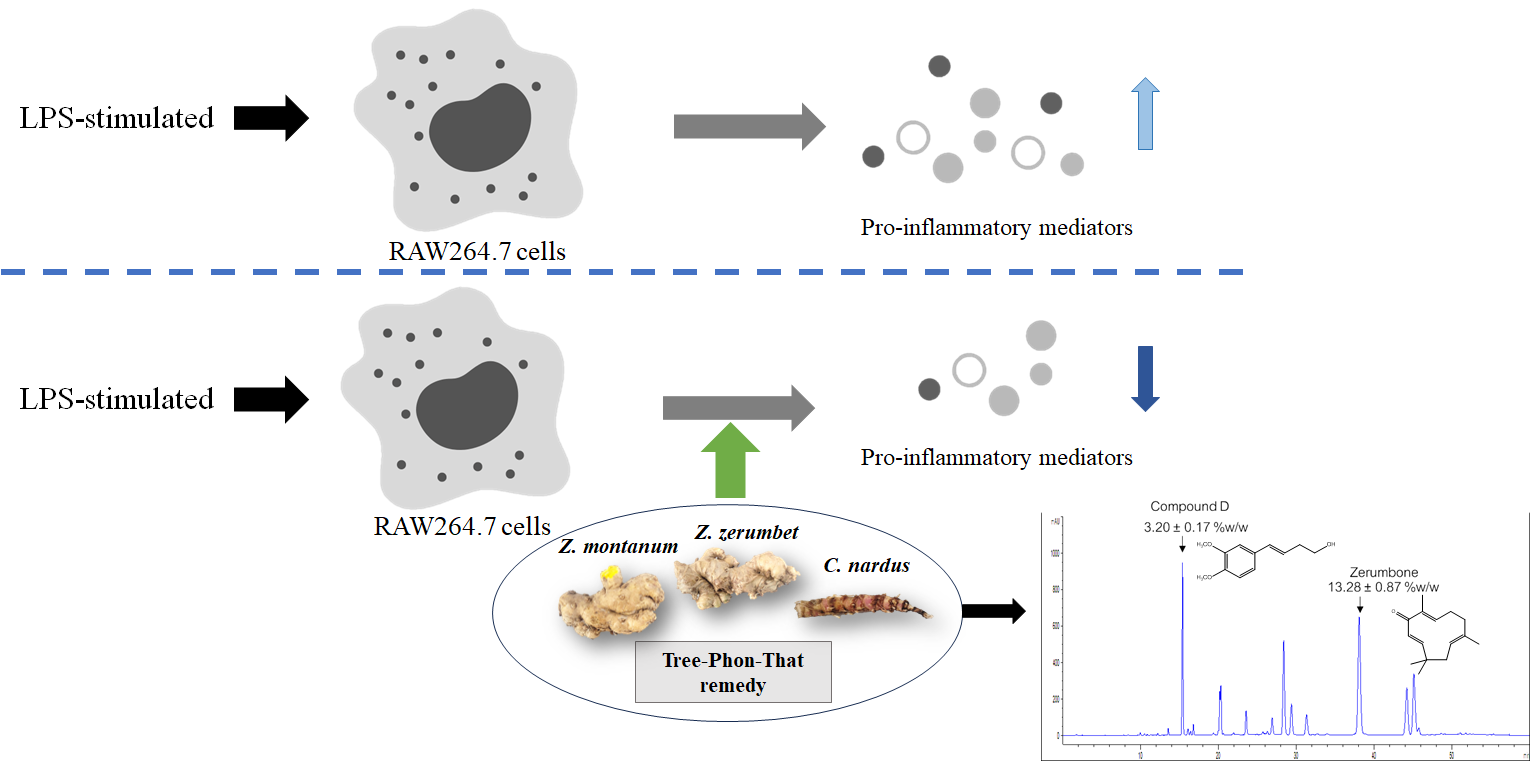 Herbal medicines are widely used to treat various physical disorders. One such remedy, Tri-Phon-That, is composed of rhizomes of three herbs: Zingiber zerumbet, Zingiber montanum, and Cymbopogon nardus. Traditionally, it is used to alleviate fever, swelling, bruising, and muscle pain-conditions associated with inflammation. This study aimed to evaluate the effects of Tri-Phon-That remedy and its individual ingredients on the production of nitric oxide (NO), interleukin-6(IL-6), and prostaglandin E2 (PGE-2). Additionally, the chemical compositions of the remedy and its plant extracts were analyzed. The results showed that the Tri-Phon-That extract strongly inhibited NO, IL-6, and PGE-2 production, with IC50 values of 5.35 ± 0.77, 7.48 ± 0.26, and 24.75 ± 0.33 μg/mL, respectively. Among the individual ingredients, Z. montanum exhibited the most potent anti-inflammatory activity, followed by Z. zerumbet, which effectively inhibited nitric oxide and IL-6 but had no effect on PGE-2. Chemical analysis using high-performance liquid chromatography revealed that the Tri-Phon-That extract contained zerumbone and compound D or (E)-4-(3’,4’-dimethoxyphenyl) but -3-en-1-ol at concentrations of 13.31 ± 0.87 and 3.16 ± 0.17 % w/w, respectively. These compounds were primarily found in Z. zerumbet and Z. montanum with concentrations of 36.05 ± 1.67 and 6.97 ± 0.28 % w/w, respectively. In contrast, no chemical constituents were found in C. nardus, which correlates with its weaker anti-inflammatory activity. In conclusion, Tri-Phon-That extract strongly inhibits pro-inflammatory cytokines, making it a promising treatment for acute inflammation.