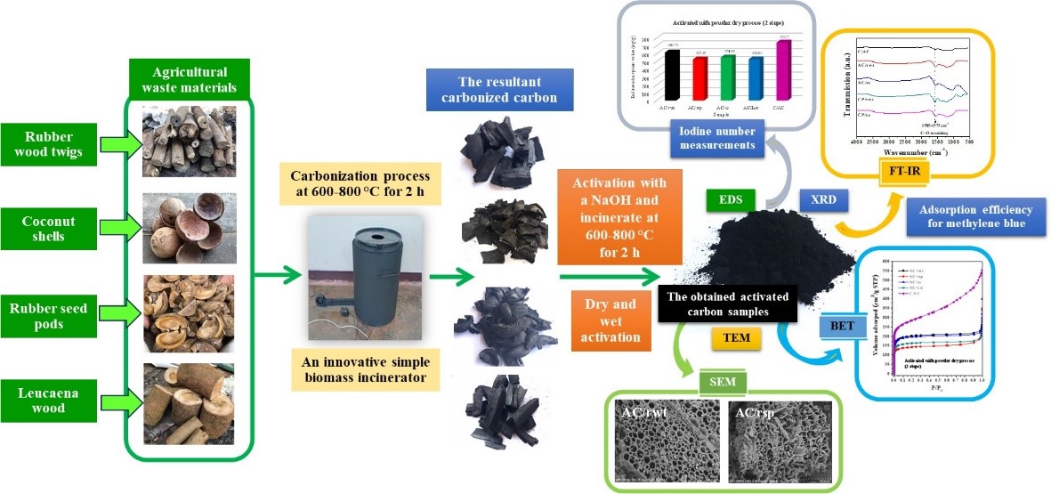 Activated carbon is widely used in environmental and industrial applications due to its high adsorption capacity. This research aimed to utilize agricultural waste materials—rubber wood twigs, rubber seed pods, Leucaena leucocephala wood, and coconut shells—as precursors for the production of activated carbon, addressing the increasing need for low-cost and sustainable adsorbents. Both dry and wet chemical activation methods were employed using sodium hydroxide (NaOH) in conjunction with a biomass incinerator. Among all the samples, activated carbon derived from rubber wood twigs (AC/rwt) via dry activation demonstrated the most favorable properties. Comprehensive characterization was conducted using X-ray diffraction (XRD), Brunauer–Emmett–Teller (BET) surface area analysis, transmission electron microscopy (TEM), energy-dispersive X-ray spectroscopy (EDS), scanning electron microscopy (SEM), and Fourier-transform infrared spectroscopy (FT-IR). Adsorption efficiency was evaluated through iodine number measurement and methylene blue adsorption tests. The AC/rwt sample exhibited a specific surface area of 726.60 m²/g, an iodine number of 616.73 mg/g, and a methylene blue adsorption efficiency of 99.65 %, which complies with Thailand’s industrial standard TIS 900 - 2004. Elemental analysis confirmed that carbon was the predominant element in all samples. Additionally, the pore size distribution indicated mesoporous structures ranging from 2 - 50 nm. Although commercial activated carbon outperformed in some metrics (950.02 m²/g surface area, 743.77 mg/g iodine number, and 100 % methylene blue adsorption), this study demonstrates that agricultural waste can be successfully converted into high-quality activated carbon suitable for diverse adsorbent applications.