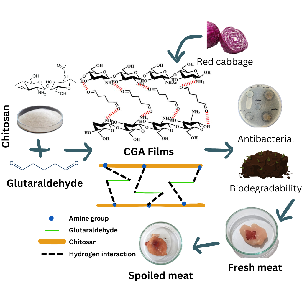 This study presents the development of a biodegradable chitosan-based film responsive to pH changes, utilizing anthocyanins from red cabbage extract as a natural pH indicator. Chitosan films were prepared with varying volumes of glutaraldehyde (GA) as a cross-linking agent through a casting method, followed by coating with red cabbage extract. The chitosan/GA films exhibited color transitions within a pH range of 2 - 13, changing from purple during the initial storage to green as chicken meat spoiled, effectively indicating freshness. FE-SEM analysis revealed that GA cross-linking resulted in a denser film structure, with a reducing porosity from 10.0% (pure chitosan) to 6.7% (chitosan/GA). The incorporation of glutaraldehyde significantly enhanced the films’ tensile strength, with the optimal strength achieved at 0.5 mL GA, representing a threefold increase compared to pure chitosan. The films also demonstrated improved mechanical stability, defined as an improved resistance to deformation under applied stress, which is crucial for packaging integrity. Additionally, glutaraldehyde modified films exhibited greater hydrophilicity, as indicated by changes in contact angle, and displayed antibacterial activity, with CG0.5 exhibiting the largest inhibition zone against S. aureus (4.9 mm). Although GA incorporation slightly reduced the biodegradation rate, the films still displayed acceptable biodegradability, defined as the ability to degrade by least 60% within 5 days sufficient for short-term food packaging applications. The red cabbage extract-coated chitosan-GA films effectively monitored meat spoilage through visible color changes and demonstrated eco-friendly degradation behavior, positioning them as promising smart packaging materials for chicken meat freshness monitoring.