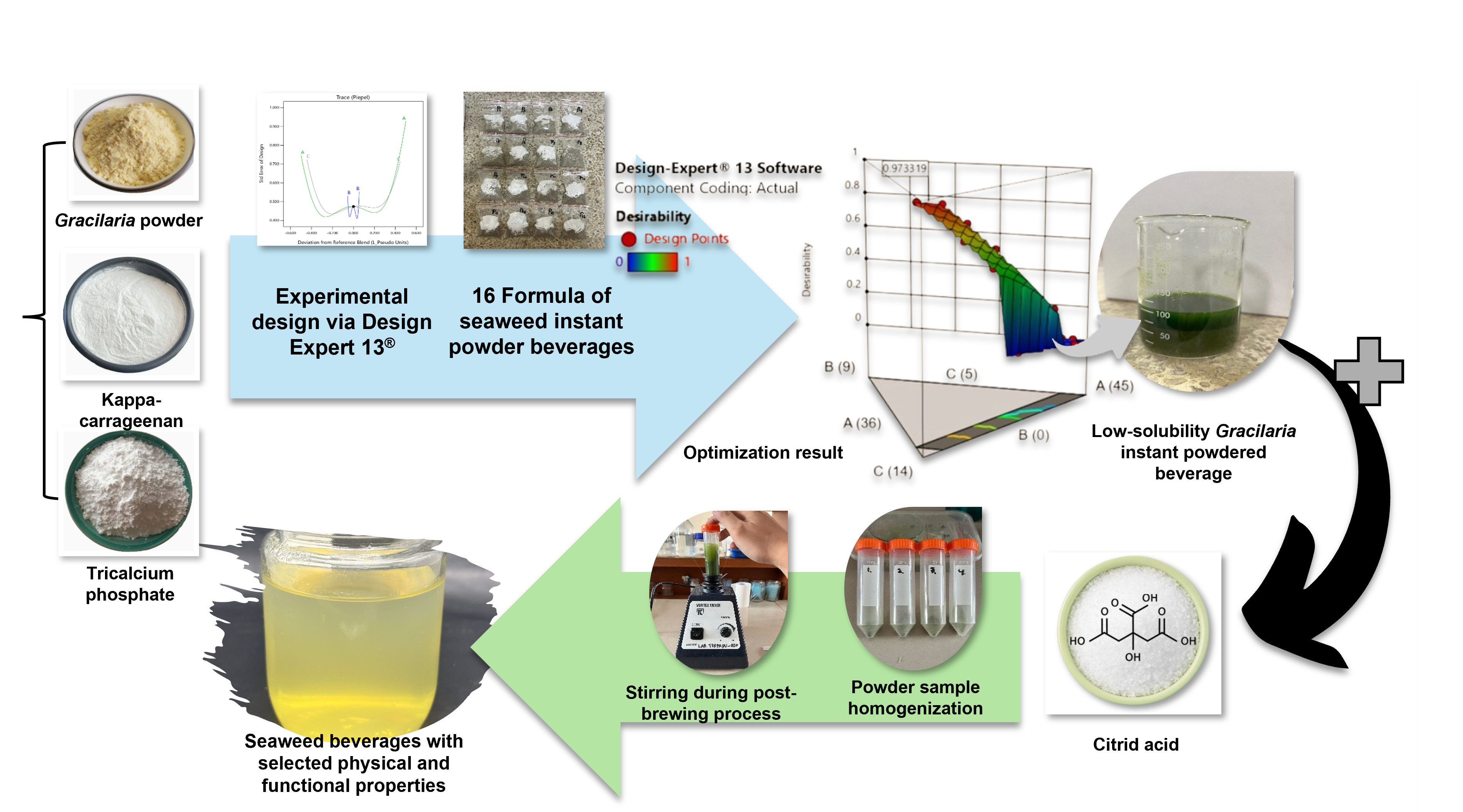 The growing demand for functional beverages has led to increased use of fiber-rich ingredients such as grains and nuts. However, the use of native seaweed as a primary ingredient in beverage formulations remains underreported. Its limited application is mainly due to processing challenges and poor compatibility with industrial requirements. Therefore, developing seaweed-based premixes offers a potential solution to enhance its usability in functional beverage products. This research aimed to optimize the formulation of an instant pre-mix powdered beverage based on Gracilaria using the I-Optimal Mixture Design, incorporating kappa-carrageenan as a stabilizer and tricalcium phosphate as an anti-caking agent and evaluated the effects of citric acid on the physical and functional characteristics of pre-mix powder. The independent variables included Gracilaria powder 36% - 45%, kappa-carrageenan 0% - 1%, and tricalcium phosphate 5% - 13%, while the measured responses encompassed moisture content, flowability, cohesiveness, flow time, angle of repose, and peak viscosity. The optimization results identified the optimal formulation as Gracilaria powder 36.52%, kappa-carrageenan 0.48%, and tricalcium phosphate 13%, yielding the highest desirability score of 0.973 with significant prediction confidence interval. To enhance solubility during the post-brewing process, citric acid was introduced as a chelating agent to improve solubility. Citric acid significantly improved the solubility of the post-brew powder, with a concentration of 4.5% producing the best CIE-L*a*b* ΔE value and solubility profile yielding a sedimentation index of 32.60% (close to the ideal < 30%), water absorption index of 2.63 g/g (> 2.2 g/g), water solubility index of 33.17%, and a ΔE value of 43.65. These findings emphasize the important role of citric acid in enhancing solubility and physical properties, thereby significantly improving the stability and overall quality of the product. This preliminary modeling of dynamic material behavior in instant powdered beverages offers a promising strategy for the food industry, supporting the demand for convenient and health-oriented products.