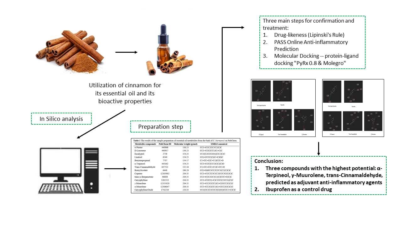 In silico approaches, including molecular docking, have emerged as powerful tools in predicting the interaction between natural compounds and molecular targets such as COX-1 and COX-2. These computational methods provide valuable insights into the binding affinity and selectivity of these compounds, making them indispensable in modern drug discovery. The interactions between metabolites from C. burmanii essential oil and COX-1 and COX-2 were investigated through in silico analysis. This analysis involves several stages, including In Silico Activity Analysis, Drug-likeness Test, Anti-inflammatory Agent Probability, and Molecular Docking. The study suggests that specific compounds could serve as anti-inflammatory adjuvants alongside conventional anti-inflammatory drugs (NSAIDs), potentially reducing dosages or minimizing the side effects associated with NSAID use. The in silico analysis results obtained by simulating the binding of metabolites with COX-1 and COX-2 target proteins using PyRx 0.8 software indicated that 12 out of 14 volatile oil metabolites might contribute to anti-inflammatory activity. However, the anti-inflammatory effects of cinnamon oil require further validation through in vivo testing.