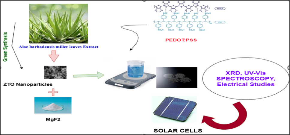- Best performance found with a 1:1 ratio of ZTO nanoparticles extracted from Aloe barbadensis mill, MgF₂ as an anti-reflection coating, and PEDOT:PSS as a third layer.