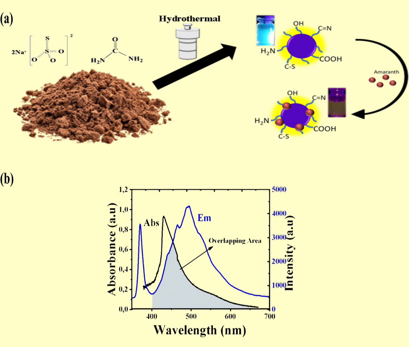 - The sensing mechanism involves fluorescence resonance energy transfer (FRET), providing dual-emission signals that shift from cyan to yellow under UV light as amaranth concentration increases.