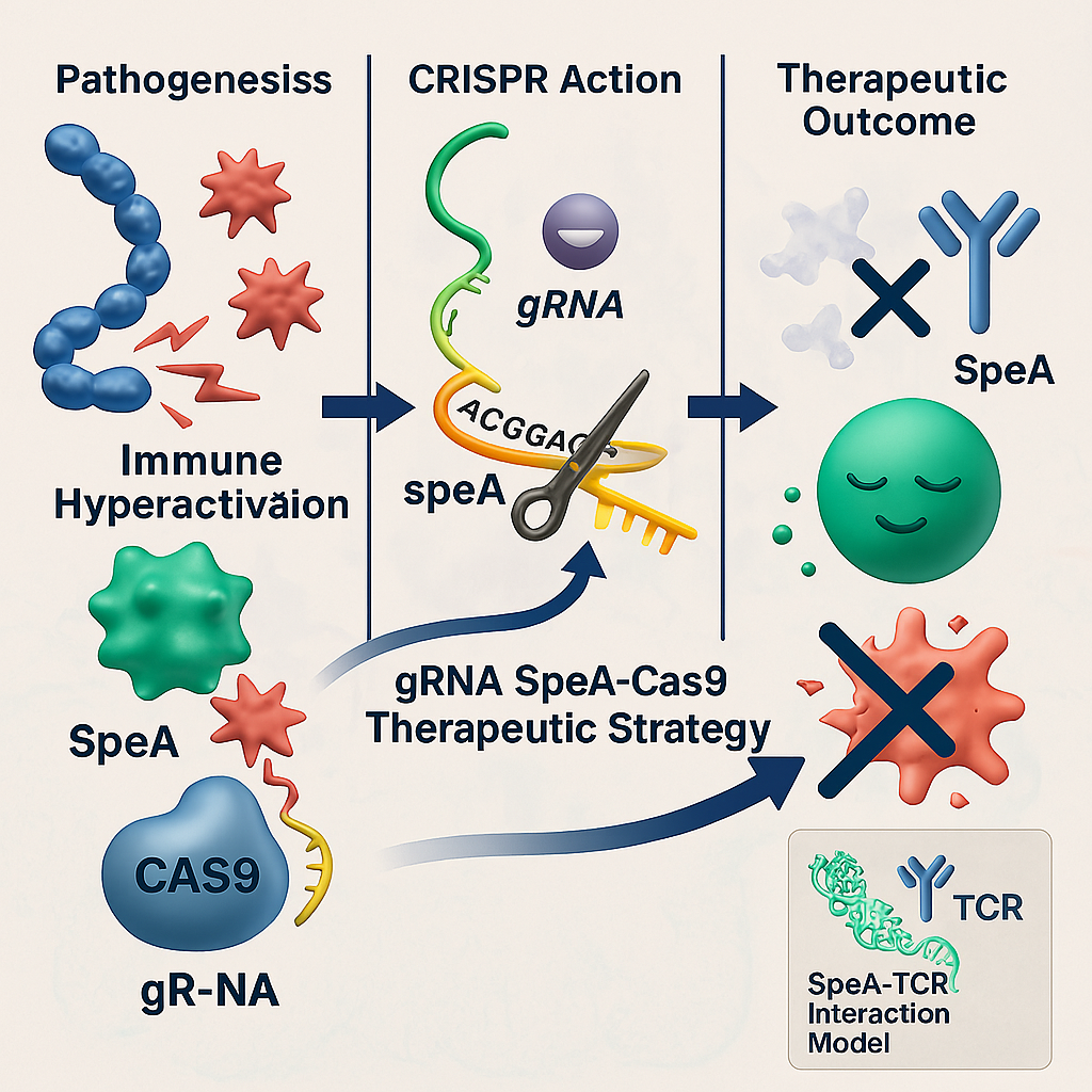 Streptococcus pyrogenic exotoxin A (SpeA) has been implicated in several S. pyogenes illnesses, including invasive and non-invasive infections. The main investigation of this study explores methods to use gRNA SpeA-Cas9 both to disrupt the SpeA-TCR interaction and decrease S. pyogenes pathogenicity. This research aims to develop and verify protective gRNA sequences as well as conduct analyzes of their structural characteristics and thermal behavior while assessing potential therapeutic possibilities. The gRNA SpeA sequence, 2D and 3D structures were predicted using the CRISPRDB, SimRNA 2.0, and RNAfold services, respectively. Geneious Prime was utilized to finish the PCR and clone gRNA-Cas9 into pCRII-TOPO. FUpred was utilized to detect the boundary domains. CGR approaches were used to map a part of the target sequence of gRNA SpeA over the whole S. pyogenes genome. The HDOCK server was used to dock SpeA and TCR molecules. EcoRI is the most suitable restriction enzyme for gRNA SpeA-Cas9 transformation. The target sequence (ACGGAGG) was determined in the A20 strain complete genome map. The optimum biochemical and biophysical properties of gRNA SpeA-Cas9 were estimated. Model 2 is appropriate for positioning the SpeA gRNA between the docking proteins (SpeA-TCR). S. pyogenes loses its virulence and its capacity to induce infection when SpeA begins to attach less strongly to host cell receptors. An effective path toward innovative treatment options is provided by the gRNA-based strategy. There is a chance that gRNA will change how much SpeA and TCR interact molecularly. This study shows CRISPR-Cas9 targeted against SpeA results in a reduction of SpeA’s specificity for TCR receptors which successfully controls immune cell overreactivity. Research reveals that targeting SpeA with CRISPR-Cas9 represents an appealing therapeutic solution to fight S. pyogenes infections as well as decrease their dangerous outcomes.