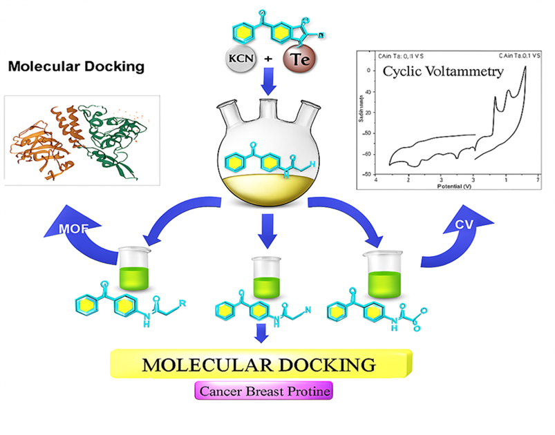 The purposes of the present study, scale up a new series of tellurium compounds based on N-(4-benzoylphenyl)-2-chloroacetamide (4-CAP), Tellurium metal (Te), potassium cyanide (KCN) & dimethyl sulfoxide (DMSO) as a solvent. This reaction is carried out in an inert atmosphere in the argon gas (Ar) is needed to get N-(4-benzoylphenyl)-2-Tellerocyanatoacetamide; beyond this, derivatives are synthesized, and organyl tellurium trihaleds. All synthesized compounds were characterized by (FT-IR), (1H-NMR) & mass spectroscopies. The spectroscopic data were in good agreement with the proposed chemical structures of the synthesized compounds. The cyclic voltammetry of all synthesized and characterized compounds was scanned at 0.1 and 0.3 v/s. To track the number of redox states in each compound, determine the required potential for each reaction, find the potential difference and get the anodic/cathodic current ratio. To generate 3D structures of the newly compounds for molecular docking, Chemdraw software files were converted and used after energy minimization. The files were preoptimized with semiempirical AM1 method using Hyperchem 8.08 software files. The files were optimized using density functional theory (DFT) method with the B3LYP/6-31G basis set which is well proven for describing the most stable conformation and used to calculate global reactivity descriptors through Gaussian 09 also. All of these have some default values before achieving “YES”. Density functional theory (DFT) calculations were used to study the molecular structures of the synthesized organotellurium compounds. The geometry, HOMO, LUMO, and energy gap were generated from calculations of optimized structures. Comparing the HOMO energies, it was possible to study the donor and acceptor properties of the prepared organotillurium compounds. Finally, several important chemical properties such as electronegativity, electrophilicity, ionization potential, and electron affinity were calculated and discussed.