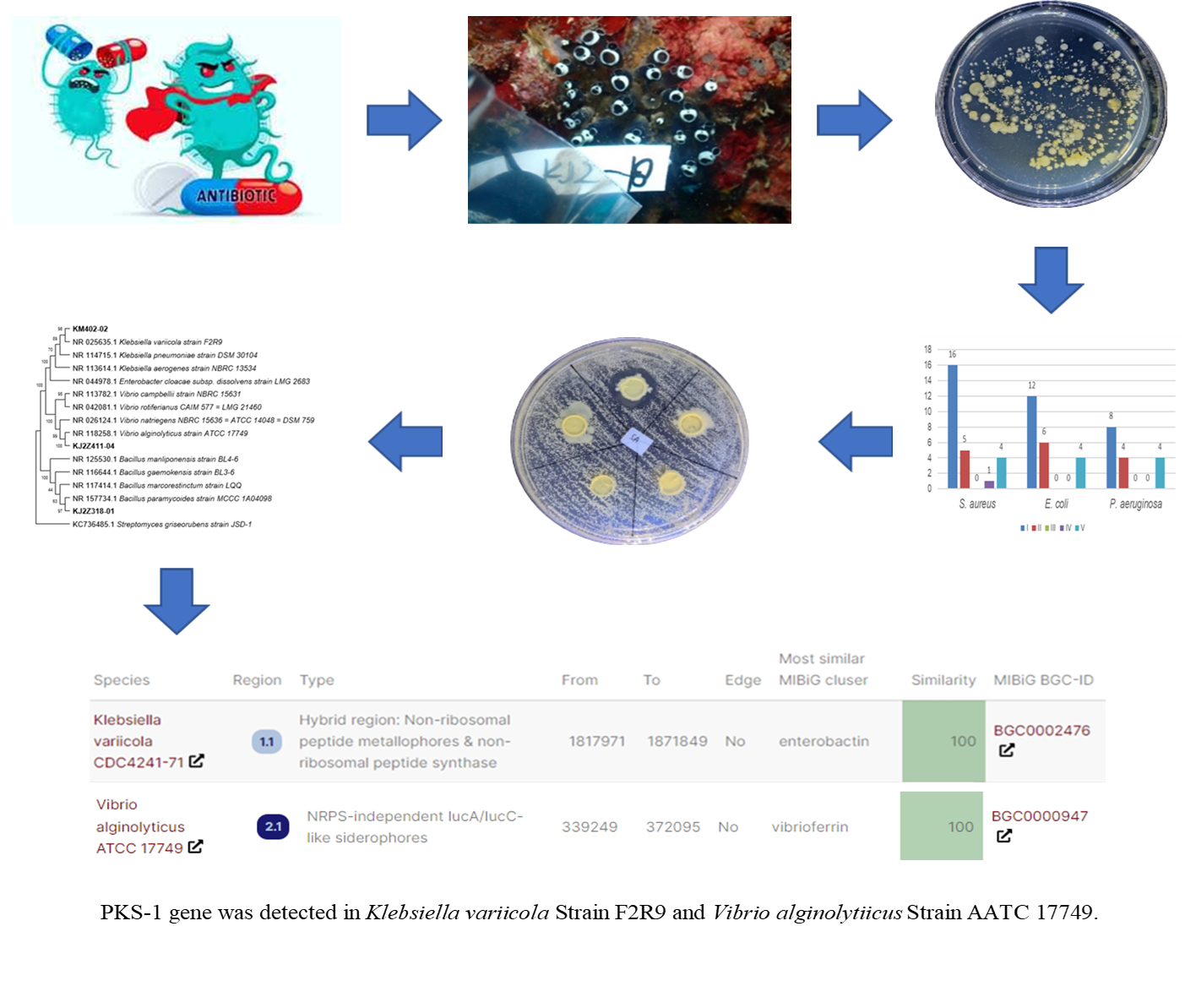 - Isolate KJ2Z318-01 is Bacillus paramycoides (homology 99.86%) able to inhibit MDR aureus (7.8 mm) and E. coli (4.1 mm). PKS-1 gene was detected in Klebsiella variicola and Vibrio alginolytiicus.