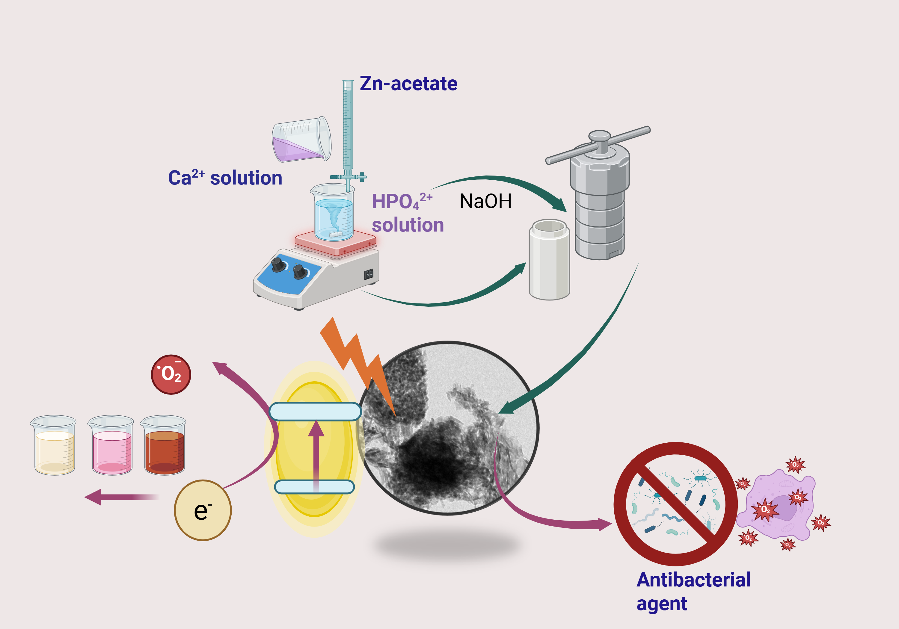 This study explores the effect of zinc (Zn) content on the physicochemical characteristics, photocatalytic activity, and antibacterial activity of hydrothermally synthesized hydroxyapatite (HAp). Zinc doped HAp (Zn-HAp) was synthesized with varying Zn content of 1, 2 and 5 wt%, and characterized using XRD, FTIR, UV-Vis DRS, TEM, and zeta potential analysis. Characterization results showed that Zn was successfully dopped into the HAp structure without forming its own ZnO phase, with a decrease in crystallite size and band gap. Photocatalytic activity test was conducted by degradation of tetracycline (TC) antibiotic using UV light. The results show that Zn-HAp has higher photocatalytic activity than pure HAp, with the highest degradation efficiency of 90.48% obtained at 1Zn-HAp. The photocatalytic activity increased as the band gap decreased, which was facilitated by Zn doping. In addition, antibacterial tests against Escherichia coli and Staphylococcus aureus showed that Zn-HAp had a larger inhibition zone than pure HAp, indicating an increase in antibacterial activity, especially at higher Zn concentrations.