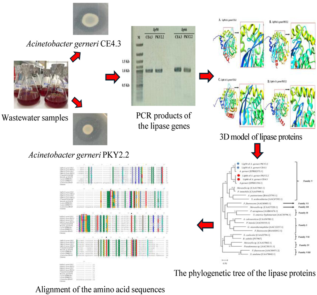 Lipase-producing bacteria isolated from grease traps of canteens at the University of Phayao were identified as Acinetobacter gerneri (A. gerneri) CE4.3 and PKY2.2. Both strains possess lipase genes (lip50 and lip66), which encode proteins (Lip50 and Lip66) containing conserved domains essential for lipase activity. Phylogenetic analysis, together with multiple sequence alignment, indicates that these proteins belong to lipase family V. This study provides fundamental information supporting further research and the potential biotechnological applications of lipase enzymes from A. gerneri.