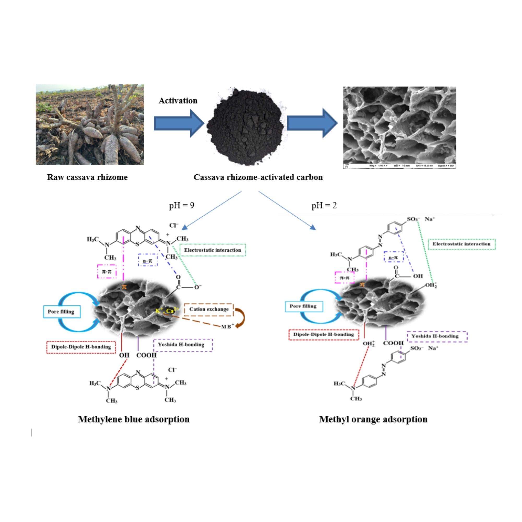 - Cassava rhizome-activated carbon demonstrates effective adsorption of dye solutions, including methylene blue (a cationic dye) and methyl orange (an anionic dye).