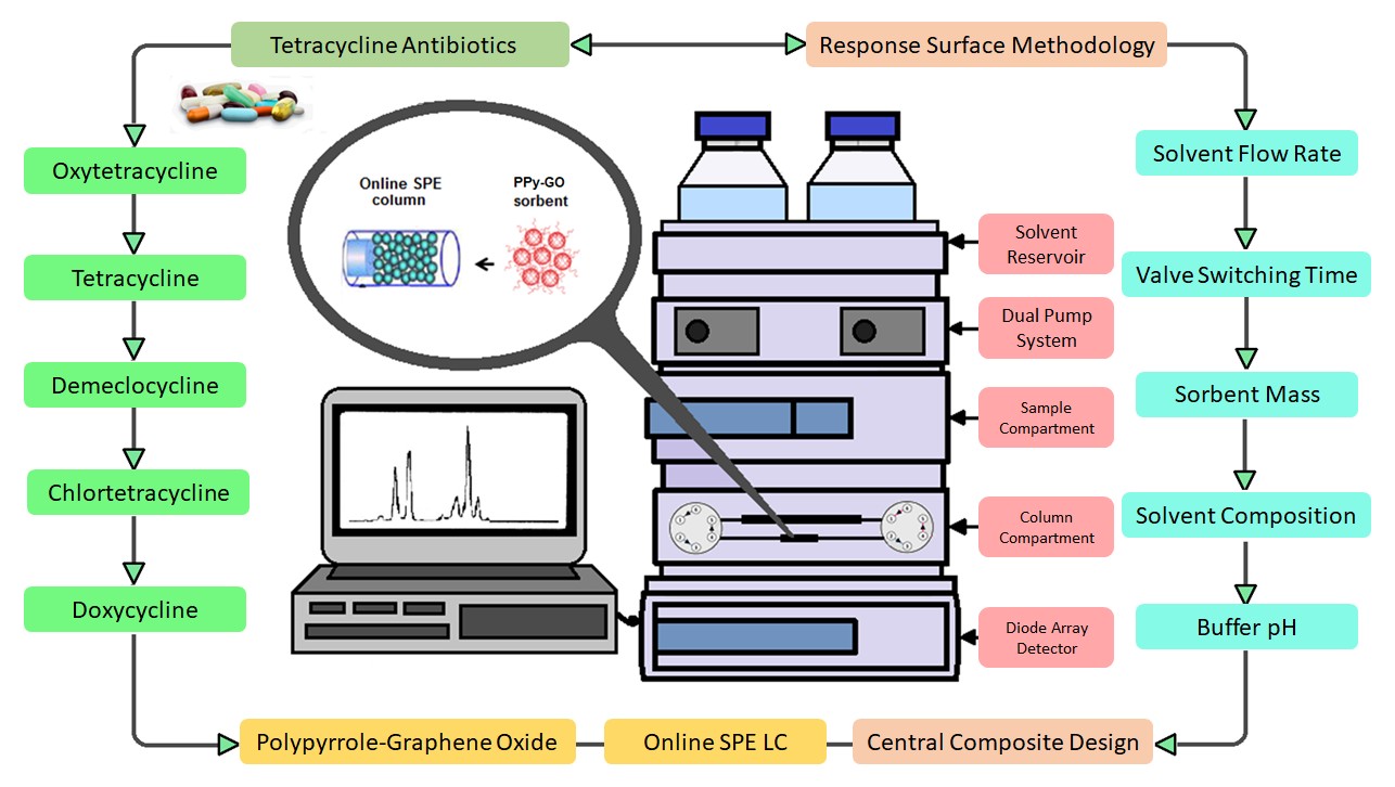 - Using Chemometric (BBD) optimization with fully automated online SPE-LC for tetracycline analysis in water samples using PPy-GO sorbent.