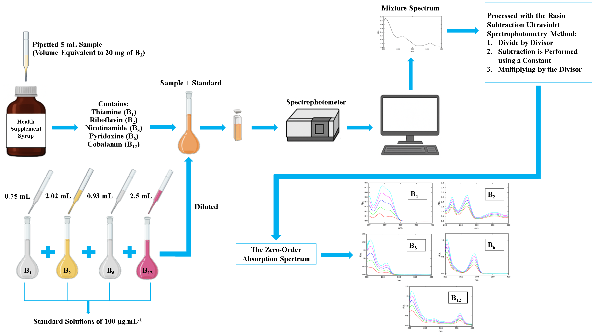 - A novel ratio subtraction UV spectrophotometry method was developed for simultaneous quantification of 5 B-complex vitamins (B1, B2, B3, B6, and B12) in multivitamin syrup formulations.
