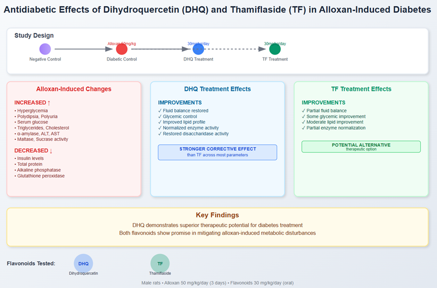 Diabetes mellitus (DM) is a major global health burden, ranking among the top three diseases leading to disability and mortality. Although some flavonoids exhibit antidiabetic properties, the effects of many remain insufficiently explored. This study investigates the potential of 2 flavonoids—dihydroquercetin (DHQ) and thamiflaside (TF)—to mitigate alloxan-induced diabetes in rats, thereby addressing an important gap in current knowledge. Male rats were divided into 4 groups: Negative control, diabetic (positive control), and two treatment groups receiving either DHQ or TF (30 mg/kg/day, per os) following alloxan induction (50 mg/kg/day, intraperitoneally for 3 days). Alloxan administration resulted in significant hyperglycemia, polydipsia, polyuria, and elevated levels of serum glucose, triglycerides, cholesterol, α-amylase, ALT, and AST, as well as increased maltase and sucrase activity in the small intestinal mucosa. Conversely, levels of insulin, total protein, alkaline phosphatase, and glutathione peroxidase were significantly reduced. DHQ treatment led to marked improvements in fluid balance, glycemic control, lipid profile, enzyme activity in serum, and disaccharidase activity in the intestinal mucosa. Notably, DHQ showed a stronger corrective effect than TF across most parameters. These findings highlight DHQ as a promising candidate for the treatment of diabetes and its associated metabolic disturbances, while also supporting TF as a potential alternative.