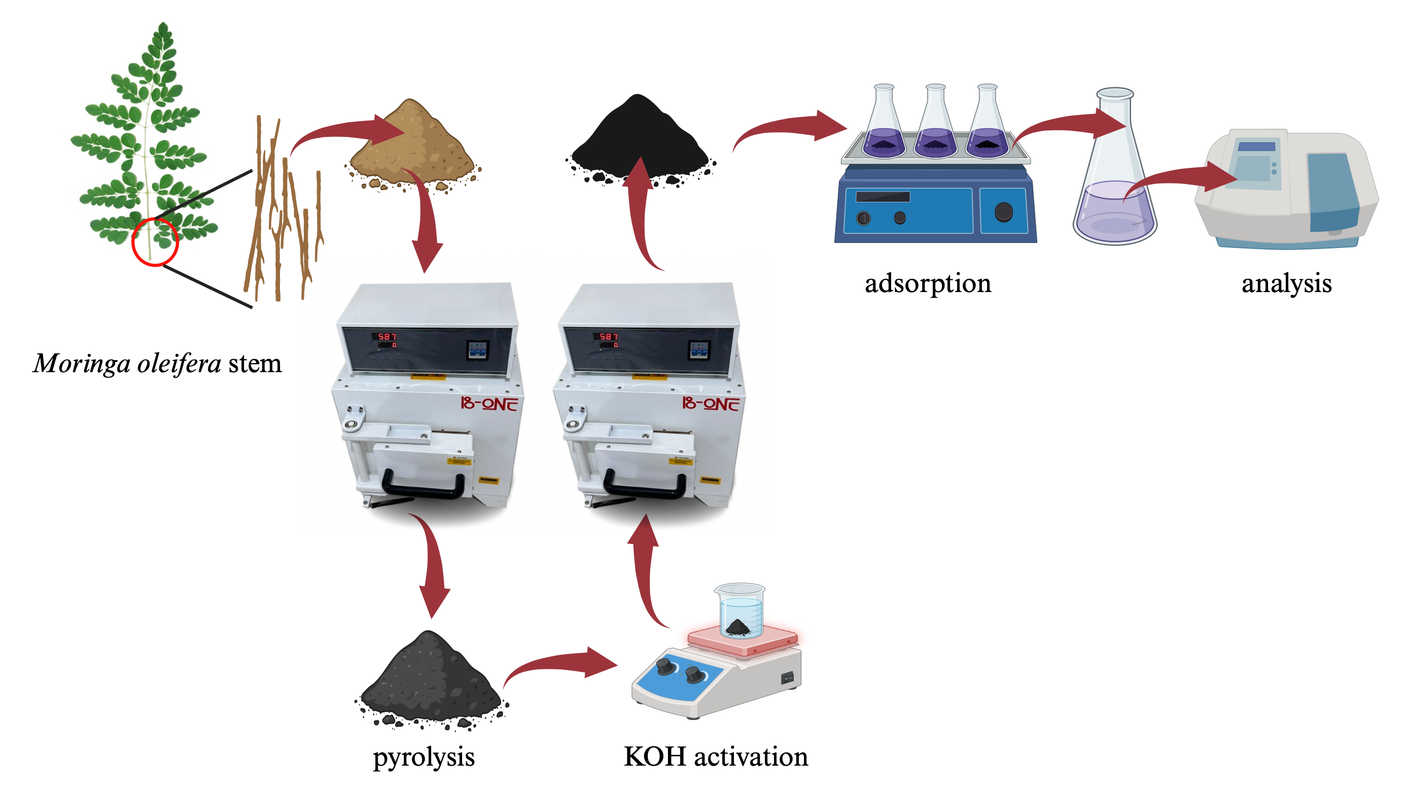- Moringa oleifera stem was used in the preparation of activated carbon via KOH activation.