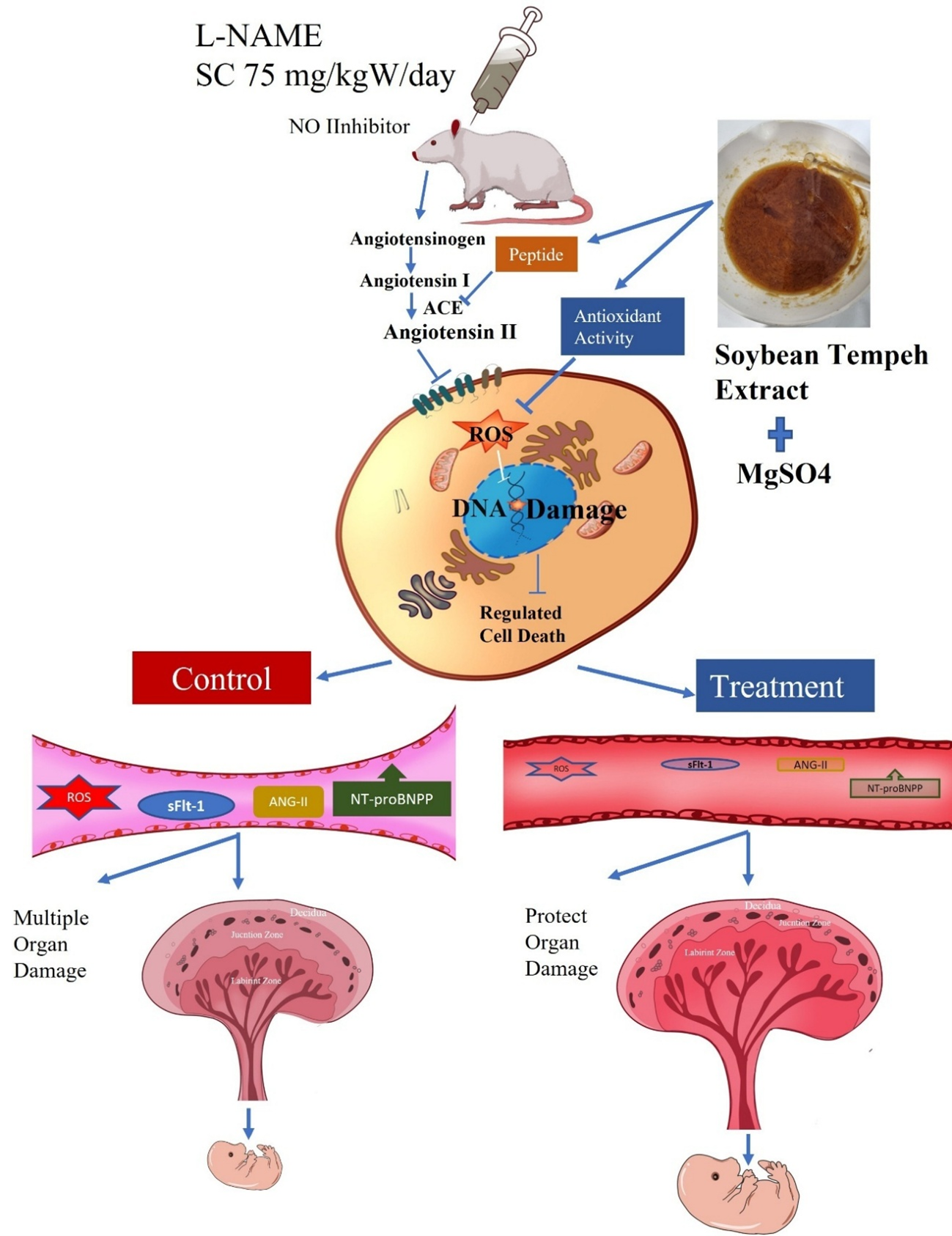 Preeclampsia is a pregnancy complication that affects multiple organs. Antioxidant approaches have been widely studied to address it, but their bioavailability is limited. This study aims to analyze effects of Soybean Tempeh Extract (STE) on improving oxidative stress, cardiovascular function, angiogenic and fetal weight in preeclamptic rats. A total of 30 Sprague Dawley pregnant rats were divided into five groups: Normal, negative control, positive control (MgSO4), Treatment 1 (STE), and Treatment 2 (STE + MgSO4). Induction of preeclampsia was carried out with L-NAME, and STE was given at a dose of 400 mg/kgBW/day. MDA, NT-proBNP, sFlt-1, Angiotensin II and urine protein levels were measured using ELISA or other biochemical methods. Examination of the labyrinthine/junction zone ratio and ventricular thickness using histology. Measurement of blood pressure and protein is measured periodically. Data were analyzed by one-way ANOVA and repeated-measure ANOVA. STE significantly reduced MDA, NT-proBNP, sFlt-1, Angiotensin II, blood pressure, proteinuria, and fetal weight (p < 0.001) and improved the labyrinthine/junction ratio in histopathology placental tissue (p < 0.001) compared to the negative control group. Heart ventricular thickness in histopathology also showed similarities to the normal group although not significant. STE improves clinical and molecular parameters in preeclamptic rats, especially in reducing oxidative, angiogenic, cardiovascular stress, and fetal weight. Soybean tempeh extract has the potential as a local food-based adjuvant therapy in efforts to improve preeclampsia.