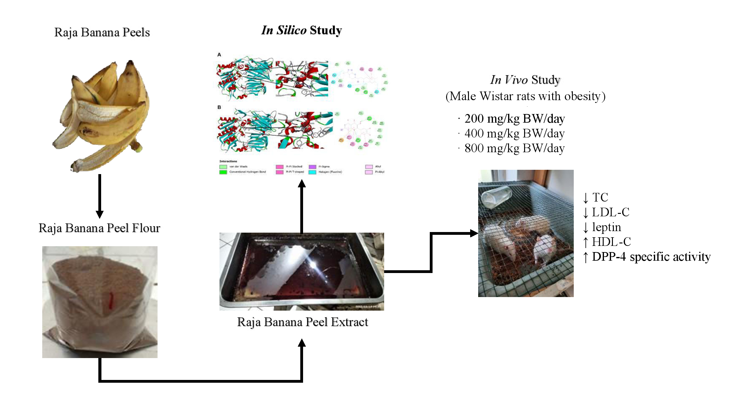 Banana peels contain nutrients and active compounds that have anti-obesity effects. Quercetin and flavonoids identified in banana peels have emerged as a promising candidate for developing novel therapeutics to address obesity. Quercetin can reduce fat accumulation by regulating lipogenesis. Research on in silico on banana peel extract and the effects of banana peel on lipid profiles and adipokine levels is still limited. This study aimed to analyze the effects of raja banana peel extract (RBPE) on lipid profiles, dipeptidyl peptidase-4 (DPP-4) specific activity, leptin, and adiponectin levels in male Wistar rats with obesity. Molecular docking was performed to demonstrate the interaction between quercetin and DPP-4, leptin, and adiponectin receptors in carbohydrate and fat regulation. An in vivo study used a pre-posttest control group design in 30 male Wistar rats with obesity. This study measured total cholesterol (TC), low-density lipoprotein cholesterol (LDL-C), high-density lipoprotein cholesterol (HDL-C), triglyceride (TG), DPP-4 specific activity, leptin, and adiponectin levels. The results showed that the RBPE administration decreased significantly TC (p < 0.001) and LDL-C levels (p < 0.001), increased HDL-C level (p < 0.001), increased DPP-4 specific activity (p < 0.001), and reduced leptin levels, but did not increase adiponectin levels (p = 0.274). In conclusion, RBPE administration might offer a promising therapeutic approach for obesity by regulating cholesterol and lipid metabolism.