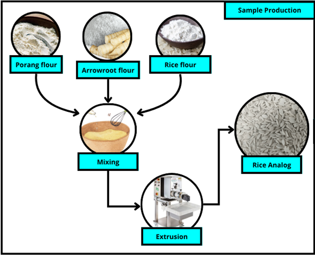 Analogue rice, Arrowroot flour, Porang flour, Rice flour, MOCD, Extrusion, eGIAbstract