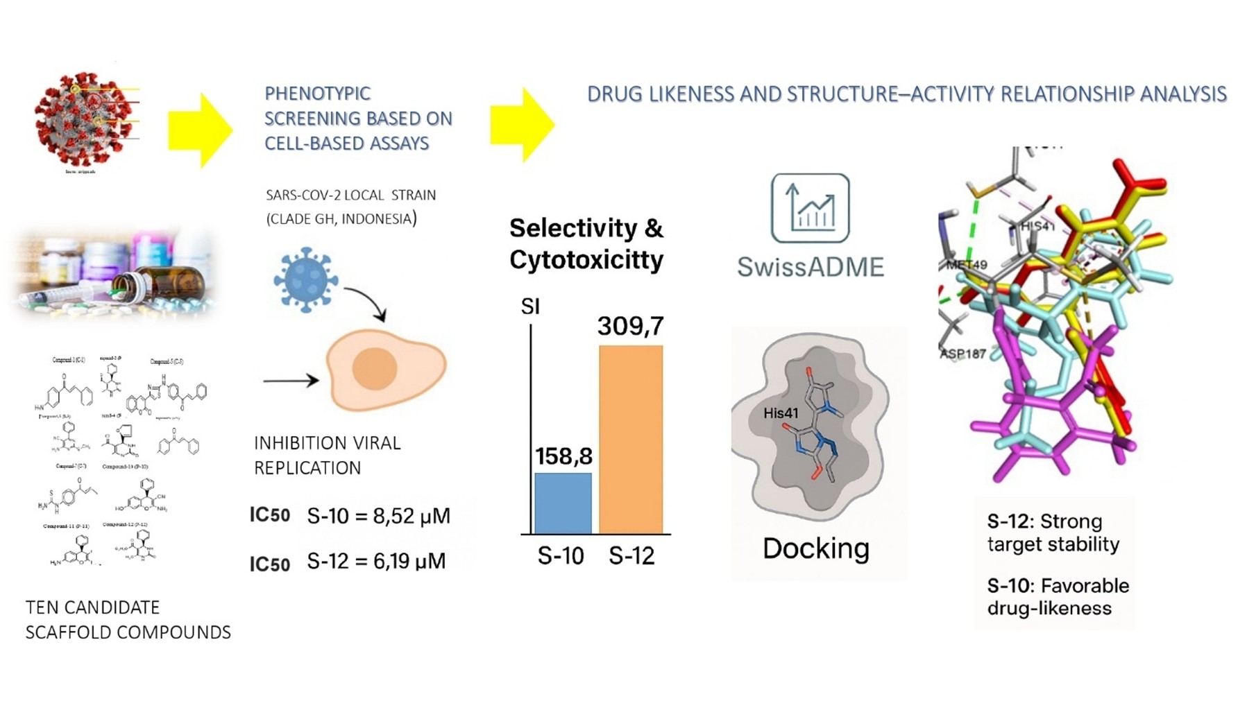 - Phenotypic screening was performed against a locally isolated SARS-CoV-2 strain (Clade GH, Indonesia) provided, direct biological relevance rather than relying solely on predictive models and supporting region-specific therapeutic development.