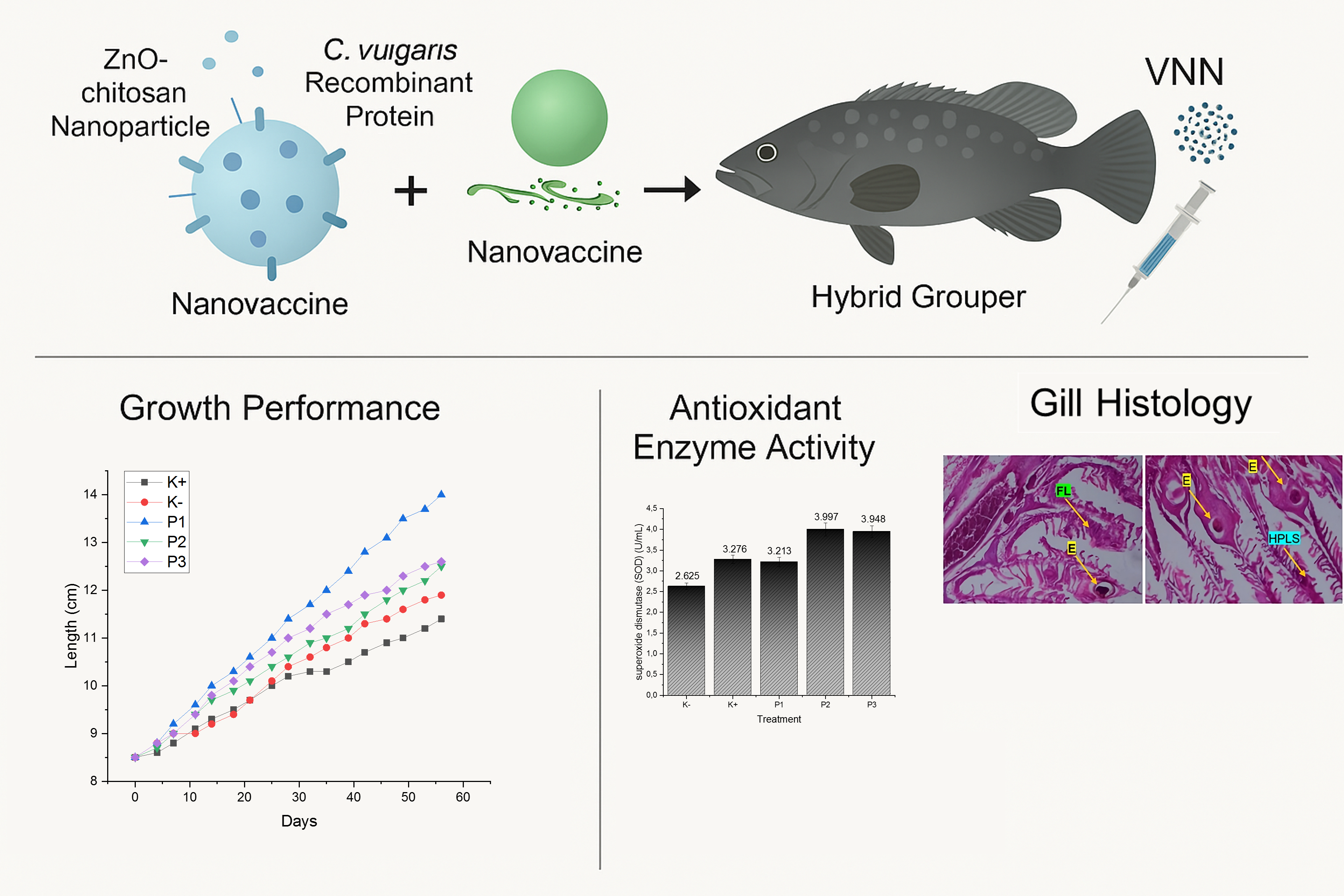 - The nanovaccine significantly improved growth performance, with the 33 µL dose (P1) showing the highest increase in body length and weight during both vaccination and post-infection phases.