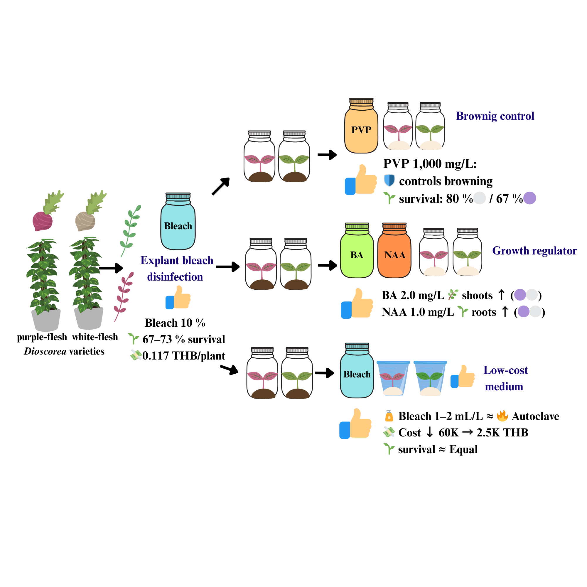 Indigenous Dioscorea species are important neglected and underused species (NUS) that represent rich genetic resources for food security and medicinal applications, offering exceptional climate resilience and nutritional diversity crucial for sustainable agriculture. However, their propagation is hampered by expensive tissue culture techniques and high equipment expenses. The study optimized disinfection techniques, browning control, and growth promotion to develop comprehensive low-cost tissue culture procedures for purple- and white-fleshed indigenous Dioscorea varieties. Nodal explants were examined with commercial bleach (5% - 20%) for surface disinfection, polyvinylpyrrolidone, PVP (0 - 1,500 mg/L) for browning management, hormone combinations (BA and NAA at 0.5 - 2.0 mg/L) for morphogenesis, and alternative medium disinfection methods (bleach 0.5 - 4.0 mL/L versus autoclaving). Optimal explant disinfection was achieved using 10% commercial bleach, resulting in 67% - 73% survival at a cost of 0.117 THB (Thai Baht) per surviving plant. PVP at 1,000 mg/L substantially suppressed browning while increasing survival to 80% in white-fleshed and 67% in purple-fleshed varieties, with white-fleshed varieties regularly outperforming, purple-fleshed variants. BA at 2.0 mg/L increased shoot growth (5.87 shoots per explant), while NAA at 1.0 mg/L increased root formation (5.89 roots per explant). Bleach-based medium disinfection at 1 - 2 mL/L achieved autoclaving performance while substantially lowering equipment investment from 60,000 to 2,500 THB. These integrated protocols establish complete low-cost tissue culture systems utilizing commercial bleach for all disinfection steps, eliminating expensive laboratory equipment requirements and enabling community-based propagation systems for indigenous Dioscorea conservation in resource-constrained environments.