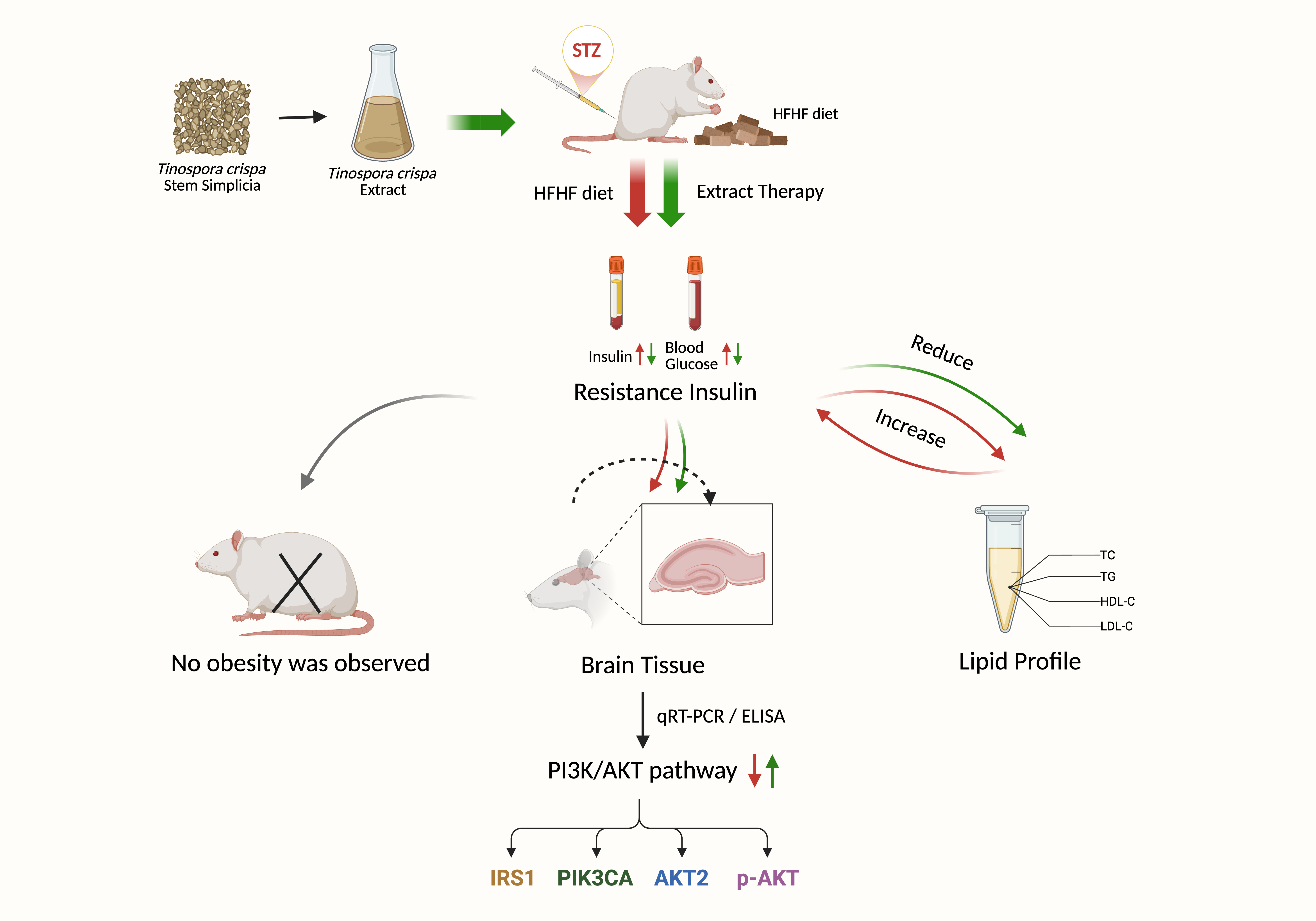 - Unlike previous studies that primarily investigated Tinospora crispa in the context of peripheral glucose regulation, this work is the first to demonstrate its potential in reversing brain insulin resistance through restoration of PI3K/Akt signaling.