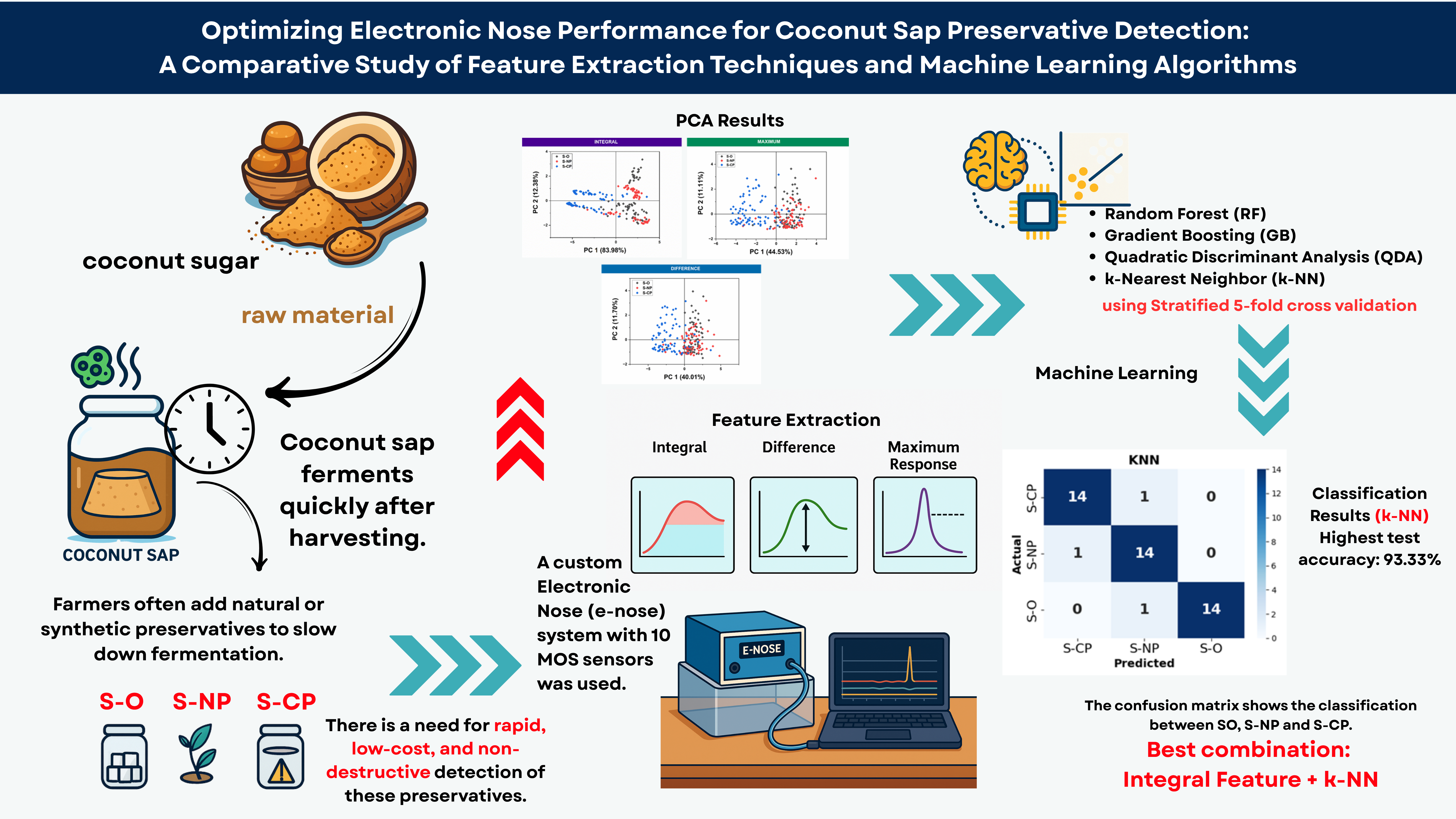Coconut Sap, E-nose, MOS Sensor, Feature Extraction, Machine Learning, Preservative, VOCs, Coconut sap, E-nose, Feature extraction, Machine learning, Preservative detection, Food safetyAbstract