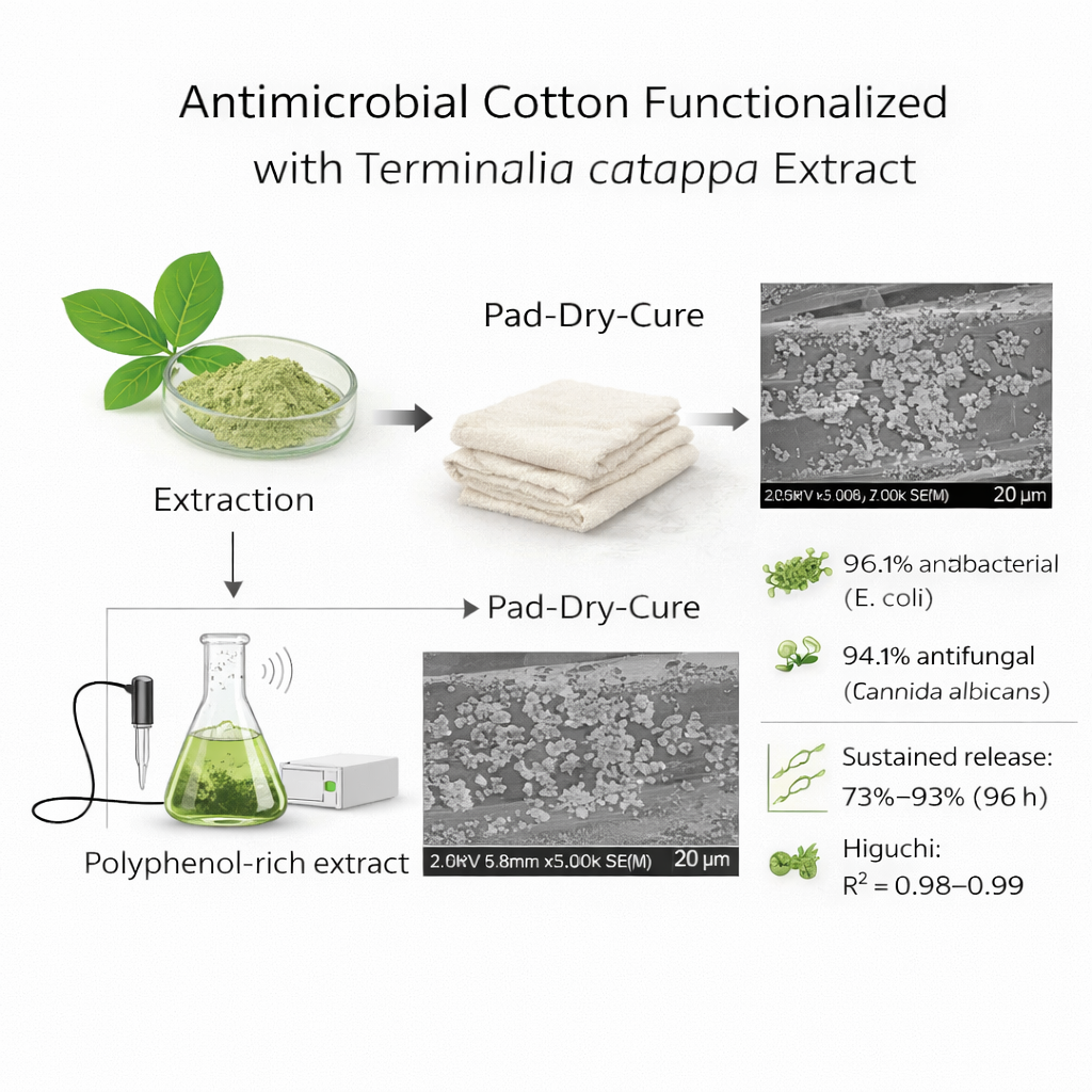 This study reports the development of multifunctional cotton fabrics finished with bioactive extract from Terminalia catappa leaves, with a focus on sustained release kinetics as a novel contribution. A Box-Behnken design was employed to optimize extract concentration (1 - 5 %w/v), bath pH (4 - 8), and treatment time (10 - 60 min). Under the optimized finishing condition (5.0 %w/v extract, pH 6.0, 60 min), the treated cotton exhibited antibacterial efficiency of 96.1% against E. coli, antifungal inhibition of 94.1% against Candida albicans, and washing durability of 90.2%. Phytochemical profiling via GC-MS confirmed the presence of dominant flavonoids (quercetin 2.29 ± 0.10 mg/g DW; kaempferol 1.96 ± 0.09 mg/g DW), phenolic acids (gallic acid 2.85 ± 0.12 mg/g DW; ellagic acid 2.05 ± 0.09 mg/g DW), and triterpenoids (β-sitosterol 5.39 ± 0.21 mg/g DW). Release studies monitored by UV-Vis spectroscopy demonstrated cumulative polyphenol release of 73% (pH 5), 84% (pH 7), and 93% (pH 9) after 96 h. Higuchi fitting (R² = 0.981 - 0.992; kH = 4.82 - 6.38 %·h−1/2) and Korsmeyer-Peppas modeling (n = 0.82 - 0.91) confirmed anomalous transport involving both Fickian diffusion and polymer matrix relaxation. SEM images showed uniform nanoscale deposition on fibers, supporting the controlled release mechanism. These findings demonstrate that T. catappa extract provides a green and effective strategy for sustainable cotton finishing, with the novelty of integrating release kinetics as a critical parameter for durability and functionality.