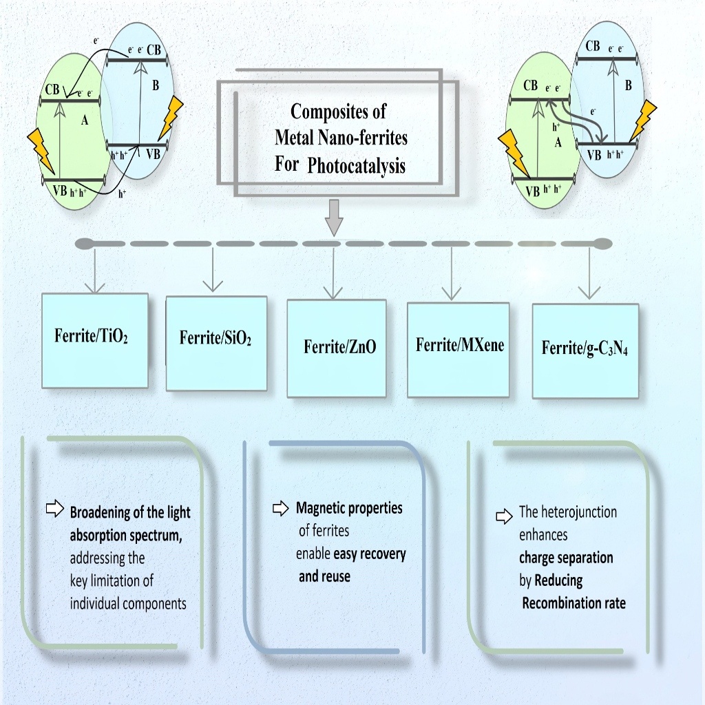 Environmental pollution, especially water contamination, presents significant challenges to ecosystems, public health, and sustainability. Ferrite-based nanomaterials, specifically hybrids combining ferrites with several materials, have emerged as promising photocatalysts for wastewater treatment. These hybrids leverage ferrites’ unique structural, optical, and magnetic properties while addressing challenges such as electron-hole recombination, limited visible light absorption, and agglomeration. Recent advancements in synthesis techniques, including sol-gel, co-precipitation, and green methods, have enabled precise control over ferrite hybrid properties, enhancing photocatalytic efficiency and scalability. The integration of ferrites introduces synergistic effects, such as enhanced charge carrier separation, expanded light absorption into the visible spectrum, and enhanced surface area. Innovations like doping, plasmonic enhancement, and Z-scheme heterojunctions have further optimized these materials for efficient pollutant degradation. Studies have demonstrated their potential to degrade dyes, pharmaceuticals, and other emerging contaminants under visible and solar light. Despite their promise, challenges remain in understanding the mechanisms of charge transfer, optimizing synthesis for large-scale production, and ensuring stability in real wastewater conditions. This review highlights the transformative potential of ferrite-based hybrids as scalable, cost-effective, and environmentally friendly solutions for advanced wastewater treatment. Their development marks a crucial step toward mitigating water pollution and achieving global water sustainability goals.
