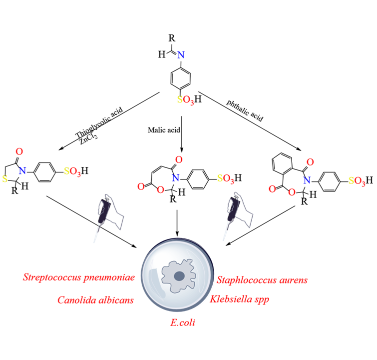 Heterocyclic compounds represent one of the most important classes in organic chemistry due to their wide range of biological and pharmacological activities. In this study, new Schiff bases were synthesized through the condensation of benzaldehyde derivatives with para-aminosulfonic acid. These intermediates were subsequently cyclized to obtain four-, five-, and seven-membered heterocyclic systems, including thiazolidine, oxazepine, and benzooxazepine derivatives. The structures of the synthesized compounds were confirmed using elemental analyses and spectral techniques (IR, ¹H-NMR, and ¹³C-NMR). The antimicrobial activity of the prepared compounds was evaluated against Gram-positive and Gram-negative bacterial strains, as well as yeast species. Results revealed that compounds 8, 10, 11, and 13 displayed notable inhibitory effects, particularly at higher concentrations, with compound 13 showing the strongest biological activity. Furthermore, molecular docking simulations demonstrated favorable binding interactions of selected compounds with the active sites of target proteins, indicating their potential as promising leads for drug development.