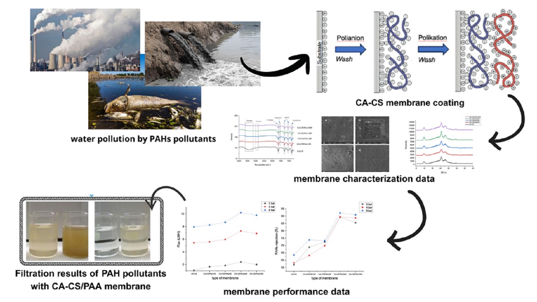 The CA-CS membrane coated with a PAA complex polyelectrolyte offers anti-fouling properties, restoring flux to up to 78%, thereby providing benefits for long-term membrane use. This high anti-fouling property is due to the membrane’s superhydrophilic nature, which affects its ability to form a hydrated layer that provides a steric effect during filtration. In addition, the use of a cellulose acetate biopolymer combined with chitosan, then coated with a PAA complex polyelectrolyte and subsequently applied to the separation of PAH pollutants from wastewater, is the latest treasure in membrane technology studies, as far as the literature search has revealed.