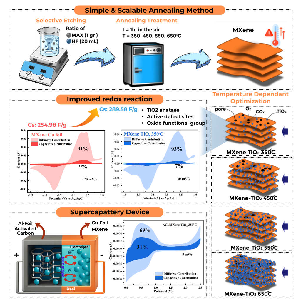 - A Novel Scalable Strategy: Introduces controlled thermal oxidation in air as a simple and scalable annealing method to engineer the surface chemistry and structure of MXene strategically.