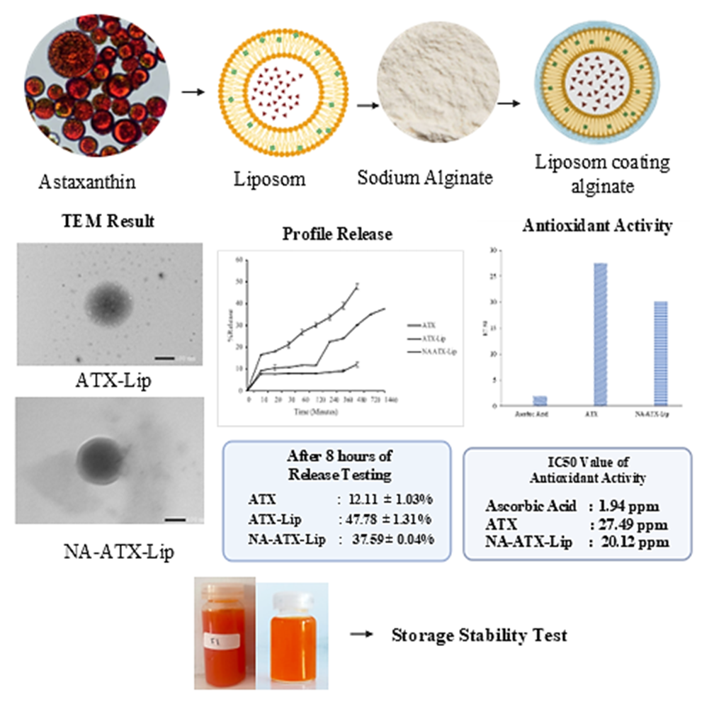 - Astaxanthin liposomes (ATX-Lip) were synthesized by the thin film hydration method and then coated with alginate (NA-ATX-Lip) through a polymer adsorption mechanism