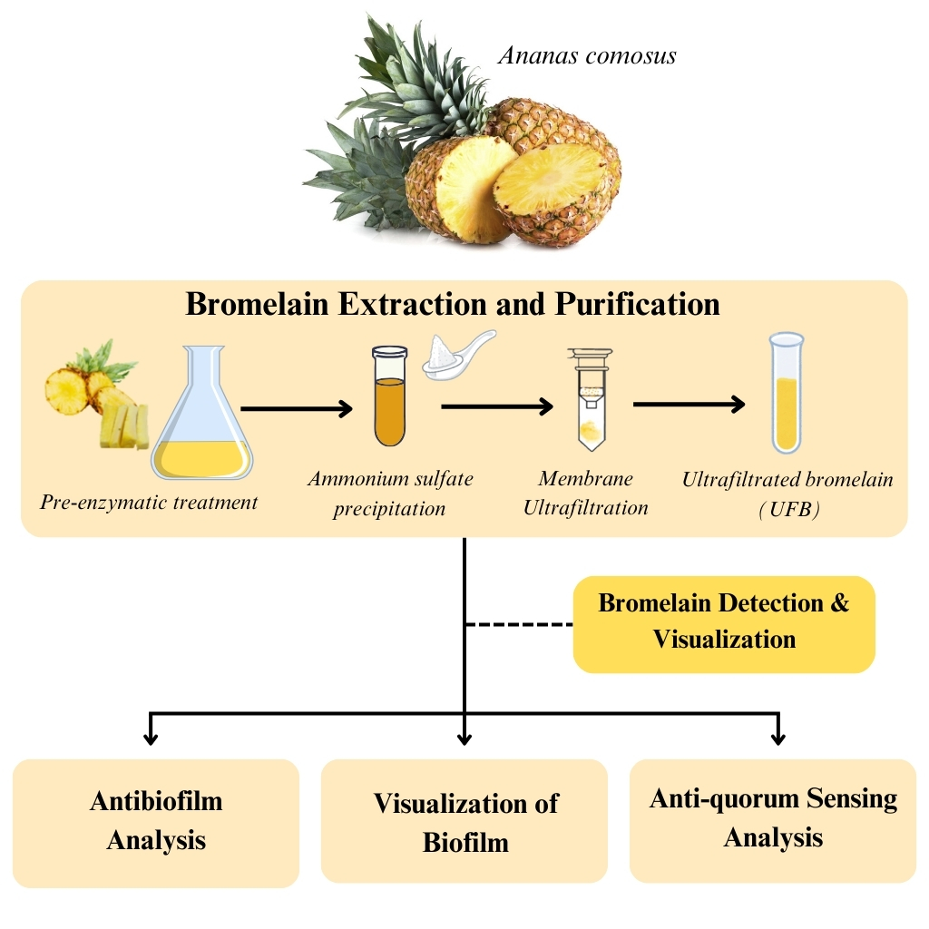 - Ultrafiltrated bromelain (UFB) was successfully isolated from pineapple core waste through a combined ammonium sulfate precipitation and ultrafiltration approach.