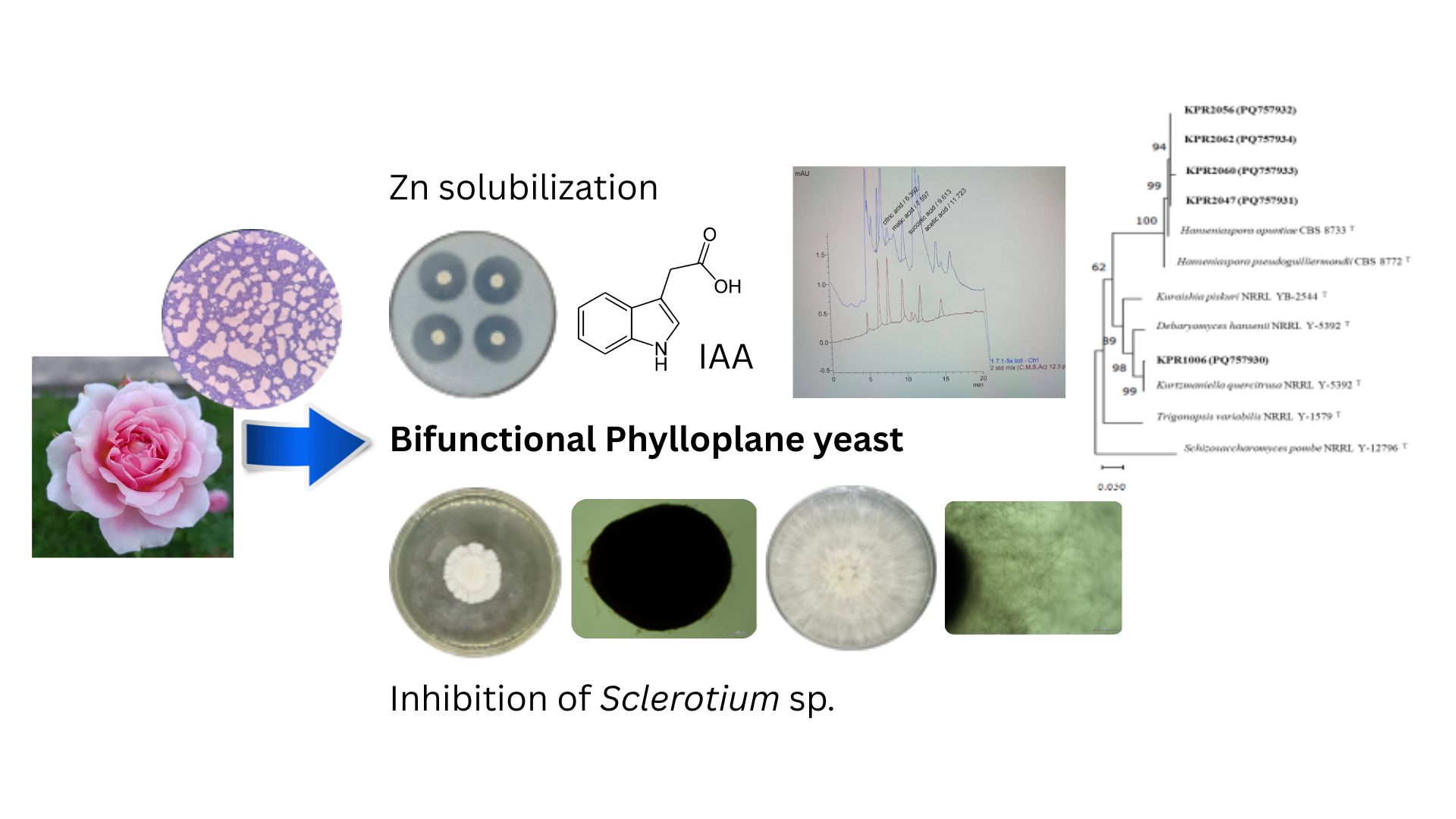 Phylloplane yeasts with remarkably high zinc solubilization efficiency and the ability to inhibit plant pathogenic fungi were isolated from rose flowers. The acid profile produced by alkalotolerant phylloplane yeast, Kurtzmaniella quercitrusa KPR1006, for zinc solubilization was demonstrated.