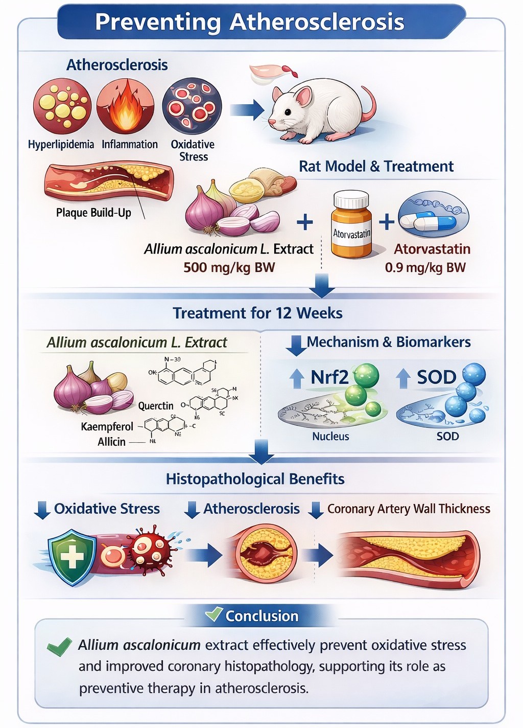 Atherosclerosis is a chronic inflammatory disease involving hyperlipidemia, inflammation, and oxidative stress as the main mechanisms. Standard therapies such as statins are not fully effective in preventing the development of atherosclerosis, so additional therapies are still needed. Allium ascalonicum L extract contains quercetin, kaempferol, and allicin, which have antioxidant potential. Objective: To analyze the therapy of Allium ascalonicum L extract variety Bima, sourced from local farmers in Brebes, Central Java, Indonesia combined with atorvastatin, which has not been specifically studied in a rat model of atherosclerosis, the duration of long-term therapy (12 weeks), and to analyze complete and integrated molecular variables. This study simultaneously analyzed oxidative stress and histopathology variables, including serum Nrf2, tissue Nrf2, SOD, and coronary artery histopathology, which are potential therapeutic targets in atherosclerosis, and assessed the correlation between serum Nrf2 and tissue Nrf2, which has not been done in previous studies. Methods: The in vivo experimental study was conducted using rat fed an atherogenic diet to induce atherosclerosis. Treatment groups received Allium ascalonicum L extract and/or atorvastatin for 12 weeks. Results: Allium ascalonicum L extract therapy significantly increased serum Nrf2, tissue Nrf2, and SOD levels (p < 0.05), and histopathology showed a decrease in the degree of atherosclerosis and coronary artery wall thickness. The best effect of Allium ascalonicum L extract was seen in group P3, which was induced with an atherogenic diet and given combination therapy with 500 mg/kgBW of Allium ascalonicum L extract and 0.9 mg/kgBW of atorvastatin. A very strong correlation was found between serum Nrf2 and tissue Nrf2 (r: 0.865). In conclusion, Allium ascalonicum L extract has been proven effective as a preventive therapy in reducing oxidative stress and improving coronary artery histopathology in rat models of atherosclerosis. Serum Nrf2 marker can be proposed as a marker for monitoring atherosclerosis therapy.
