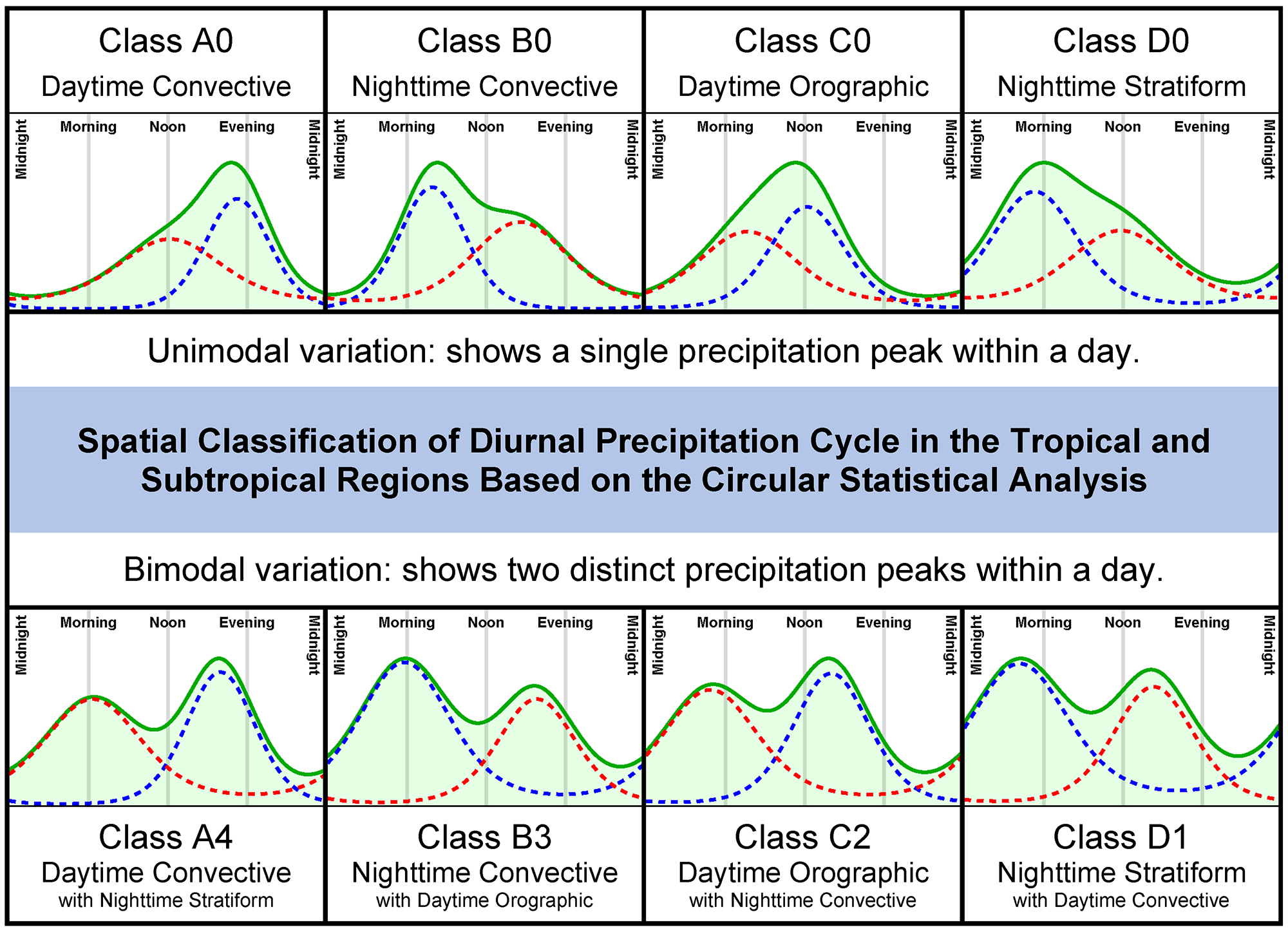 - Provides a spatial classification of diurnal precipitation into classes covering convective, orographic, and stratiform regimes, revealing clear land–ocean and topographic contrasts.