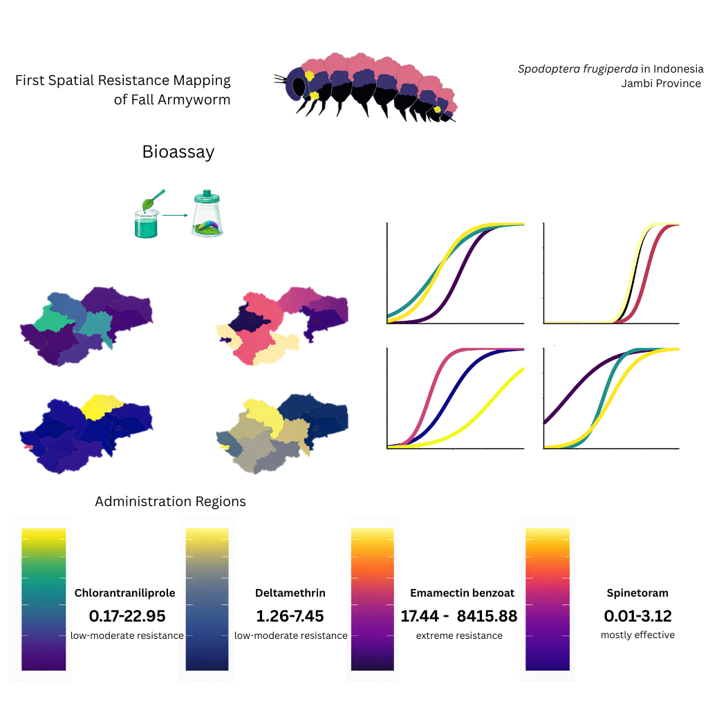 - Insecticide resistance of Spodoptera frugiperda was spatially assessed across 11 agricultural sites in Jambi Province, Indonesia.