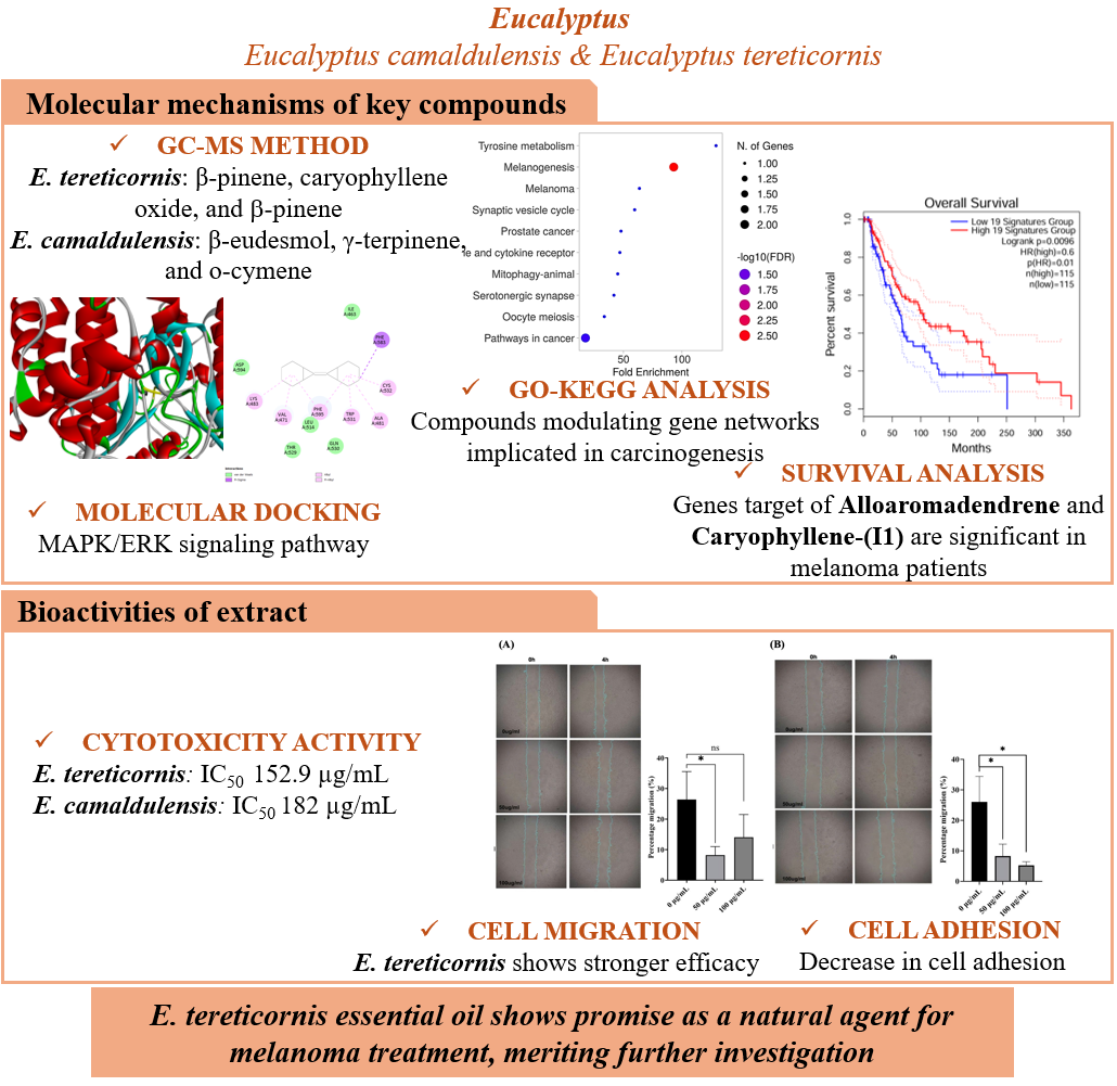 This study aimed to explore the therapeutic potential of Eucalyptus tereticornis essential oil in skin cancer treatment, with E. camaldulensis serving as a well-documented reference, both species collected in Vietnam. A multidisciplinary approach was employed to investigate chemical composition, cytotoxicity, anti-metastatic effects, and molecular mechanisms. The chemical constituents of the oils were characterized using gas chromatography-mass spectrometry (GC-MS). Cytotoxic effects were evaluated on murine melanoma B16F10 cells using the MTT assay. Anti-metastatic potential was investigated through cell migration (wound healing assay) and adhesion assays. To elucidate possible molecular mechanisms, molecular docking simulations were performed against key melanoma-related protein targets, including BRAF, NRAS, AKT3, FAK, and HDAC, and gene expression survival analysis stratified melanoma patient outcomes. GO and KEGG enrichment analyses were used to interpret functional roles. In cytotoxicity assays, E. tereticornis displayed a higher IC50 (152.9 µg/mL) compared to E. camaldulensis (182 µg/mL), suggesting higher anticancer efficacy. Moreover, E. tereticornis significantly inhibited B16F10 cell migration and adhesion, indicating potential anti-metastatic activity. GC-MS identified 46 compounds across both species. The dominant constituents in E. tereticornis were β-pinene, caryophyllene oxide, and a-pinene, while β-eudesmol, γ-terpinene, and o-cymene were major in E. camaldulensis. Docking results showed the strongest binding affinity to BRAF with the bicyclo[4.1.0]heptane, 7-bicyclo[4.1.0]hept-7-ylidene derivative (−8.5 kcal/mol). Survival analysis revealed significant prognostic associations for alloaromadendrene and caryophyllene-(I1) in melanoma patients (p < 0.05). Eucalyptus essential oils, particularly from E. tereticornis, exhibit promising antioxidant and anticancer activities, suggesting potential in melanoma therapy.