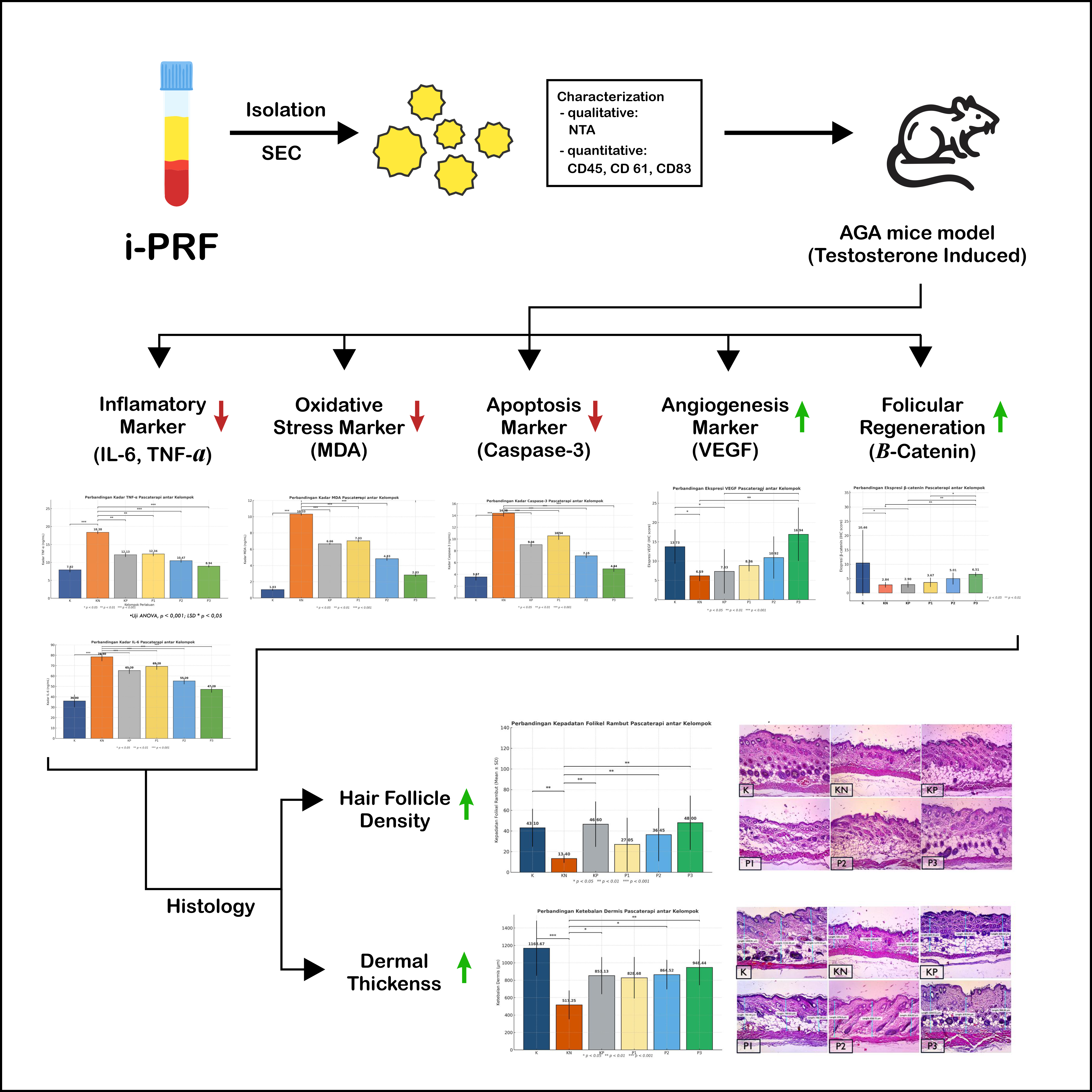 - i-PRF derived exosomes markedly decreased serum levels of pro-inflammatory (TNF-α, IL-6), oxidative stress (MDA), and apoptotic (Caspase-3) biomarkers in testosterone-induced AGA mice.