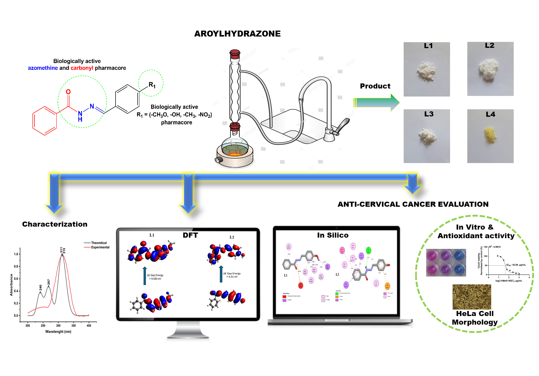 The synthesis of four aroylhydrazone-derived compounds was successfully conducted via the condensation reaction between benzoyl hydrazine and four different aromatic aldehydes. The resulting comppunds were identified as 4-Methoxybenzylidene ben-zo hydrazide (L1), 4-hidroksi-benzaldehid benzoyl hydrazone (L2), 4-methylbenzylidene benzohydrazide (L3) and 4-nitrobenziliden - 2 - benzoyl hydrazine (L4). Their spectroscopi cal and physicochemical characteristics were analyzed through UV-Vis, IR, 1H NMR, and 13C NMR instruments. Structural optimization was subsequently performed using density functional theory (DFT), followed by theoretical evaluations of UV-Vis and IR spectral modeling, reactivity and stability, and several quantum chemical descriptors. It was revealed that the theoretical results agreed with the experimental yields. The results of DFT analysis showed that L1 (ΔEGAP = 4.58 eV) and L3 (ΔEGAP = 4.42 eV) have high molecular stability and reactivity. These parameters indicate L1 and L3 as candidates for anticancer compounds. Besides, the antioxidant and cytotoxicity of the prepared compounds were observed to elucidate their specific mechanisms. L1 and L3 showed moderate anticancer activity with IC50 values of 82.12 and 42.64 µg/mL, respectively. In addition, insilico analysis, indicated strong binding affinities for L1 and L4, with docking binding energies of −9.37 and −10.57 kcal/mol. The Absorption, Distribution, Metabolism, Excretion, and Toxicity (ADMET) predictions and pharmacokinetic parameters of the samples further supported their favorable oral bioavailability.