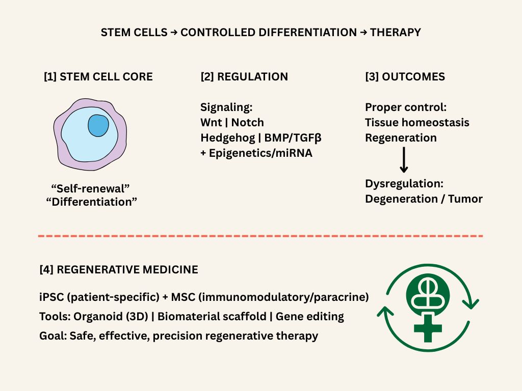 • Mechanistic foundations: Core TFs (OCT4/SOX2/NANOG) with epigenetic bivalency, plus pathway crosstalk (Wnt, Notch, Hedgehog, BMP/TGF-β) orchestrate pluripotency and fate decisions/homeostasis.