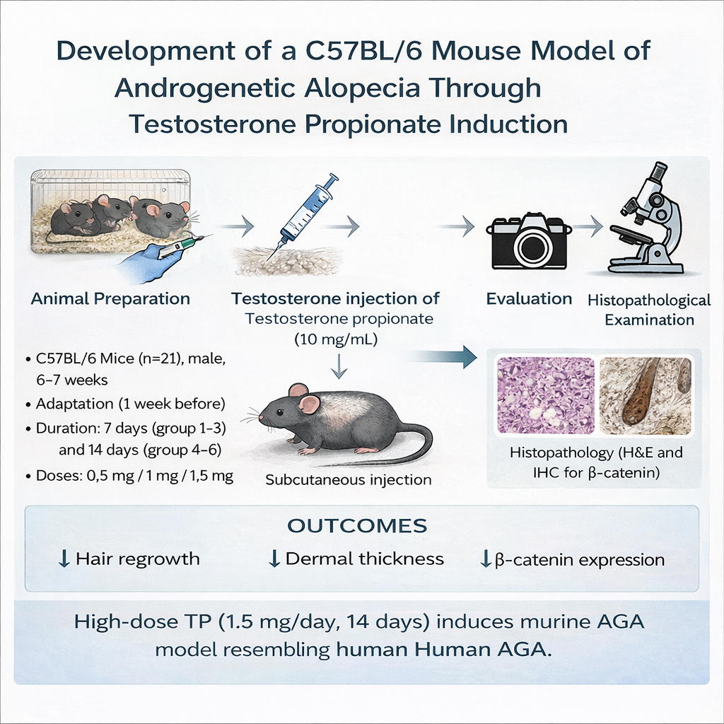 Androgenetic alopecia (AGA) is the most prevalent form of progressive hair loss, primarily influenced by genetic and androgenic factors, particularly dihydrotestosterone. Existing therapeutic options show limited efficacy, emphasizing the need for reliable and representative animal models. This study established a testosterone propionate (TP)-induced C57BL/6 mouse model of AGA and evaluated the associated clinical, histopathological, and molecular alterations within the Wnt/β-catenin pathway. Twenty-one male C57BL/6 mice were randomized into seven groups (n = 3 per group): One control and six groups receiving subcutaneous testosterone propionate at 0.5, 1.0, or 1.5 mg/day for 7 or 14 days consecutive days. Hair regrowth, dermal thickness, follicle density, and β-catenin expression were analyzed using standardized morphometric and immunohistochemical analyses. Data with normal distribution were assessed using one-way ANOVA, while non-parametric data were evaluated with the Kruskal-Wallis test, followed by LSD or Dunn’s post hoc analysis. Statistical significance was set at p < 0.05. Low-dose, short-term treatment (0.5 mg/day for 7 days) produced only mild dermal thinning and partial follicular reduction, whereas higher doses and prolonged exposure induced progressive inhibition of hair regrowth. The regimen of 1.5 mg/day for 14 days resulted in complete growth arrest, pronounced dermal thinning, follicular depletion, and marked β-catenin suppression (p < 0.001, 0.028, and 0.017, respectively). Post hoc analysis confirmed significant reductions in dermal thickness (groups receiving 1.0 - 1.5 mg/day for 7 - 14 days), follicle density (1.5 mg/day for 7 days and 1.0 - 1.5 mg/day for 14 days), and β-catenin expression <1.5 mg/day for 7 and 14 days>. Despite the small sample size, this study demonstrates that subcutaneous TP administration at 1.5 mg/day for 14 days successfully induces androgenetic alopecia in C57BL/6. This model provides a robust, reproducible, and physiologically relevant platform for mechanistic exploration and preclinical testing of therapeutic agents tergeting Wnt/β-catenin signaling.