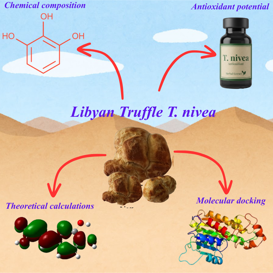 This study investigates the chemical composition, antioxidant properties, and theoretical insights into the antioxidant activity of Libyan truffle T. nivea, using extracts from petroleum ether, chloroform, and methanol. The truffles contained 12.64% protein, 6.56% fat, 5.91% fiber, and 2.58% ash, indicating their significant nutritional profile. The methanol extract showed the highest antioxidant activity with 106 mg of total phenolics (GAE/100g) and 71 mg of flavonoids (QE/100 g), resulting in 86.30% inhibition in the DPPH• assay at 1,000 μg/mL and 96.9% inhibition in the β-carotene bleaching assay at 10 µg/mL. The chloroform extract exhibited 74.88% DPPH• inhibition at 1,000 μg/mL and 85.1% inhibition at 0.5 µg/mL in the β-carotene assay, while the petroleum ether extract showed 69.09% inhibition at 1000 μg/mL in DPPH• and lower activity in β-carotene bleaching. Theoretical calculations using Density Functional Theory (DFT) revealed that phenolic compounds such as quercetin and rosmarinic acid, which possess lower energy gaps (Eg), exhibited stronger reactivity and higher antioxidant potential. For example, quercetin (Eg = 4.034 eV) and rosmarinic acid (Eg = 3.50 eV) exhibited significant biological activity due to their smaller energy gaps, indicating higher reactivity toward free radicals. In contrast, compounds such as caffeic acid (Eg = 4.148 eV) and benzoic acid (Eg = 5.76 eV) showed larger energy gaps, leading to lower reactivity and antioxidant effects. The results also indicated that hydroxyl-rich compounds, such as pyrogallol and gallic acid, had high electron density and superior antioxidant performance. Molecular docking simulations demonstrated strong binding of phenolic compounds like rosmarinic acid (‒16.15 kcal/mol) and quercetin (‒15.14 kcal/mol) with xanthine oxidase, suggesting their potential as potent antioxidants. These findings highlight the potential of T. nivea truffles, particularly the methanol extract, as a rich source of natural antioxidants with substantial nutritional and therapeutic benefits.