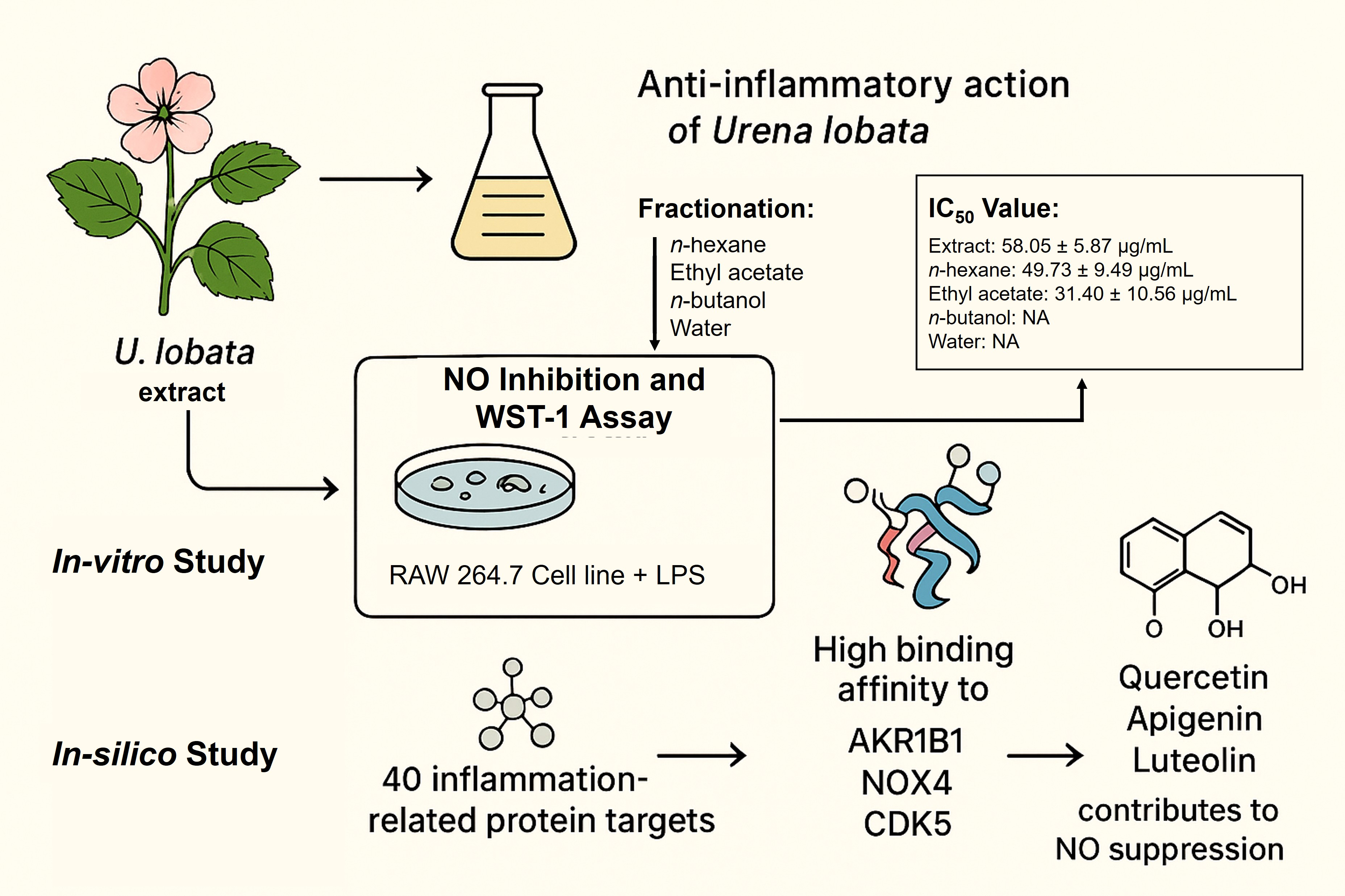 Urena lobata is recognized for its traditional medicinal use, particularly in addressing inflammation-related ailments. This study examined the anti-inflammatory properties of U. lobata extract and its fractions, focusing on their ability to suppress nitric oxide (NO) synthesis, a key mediator of inflammation. In vitro experiments using LPS-stimulated RAW 264.7 macrophages showed that the crude extract of U. lobata had an IC50 of 58.05 ± 5.87 µg/mL, while the ethyl acetate fraction showed greater suppression of NO formation with an IC50 of 31.40 ± 10.56 µg/mL. On the other hand, the n-butanol fraction and the water-soluble fraction did not have a significant effect on inhibition. Toxicity tests also showed that the n-hexane fraction was good at reducing NO formation (IC50 of 49.73 ± 9.49 µg/mL), but was toxic to cells at higher concentrations (> 200 µg/mL). The ethyl acetate fraction also inhibited the formation of important pro-inflammatory mediators, such as inducible nitric oxide synthase (iNOS), interleukin (IL)-12, and tumor necrosis factor-alpha (TNF-α). Protein target analysis revealed 40 proteins associated with the inflammatory cascade as potential targets for active chemicals in U. lobata. Molecular docking studies identified quercetin, apigenin, and luteolin as key bioactive compounds with strong binding affinity for inflammation-related proteins such as AKR1B1, NOX4, and CDK5, which subsequently influence NO suppression during inflammation, suggesting a multi-target mechanism of action. These results emphasize the therapeutic potential of U. lobata and its bioactive chemicals as candidates for natural anti-inflammatory drug formulations, while also underscoring the need to evaluate potential cytotoxicity in future studies.