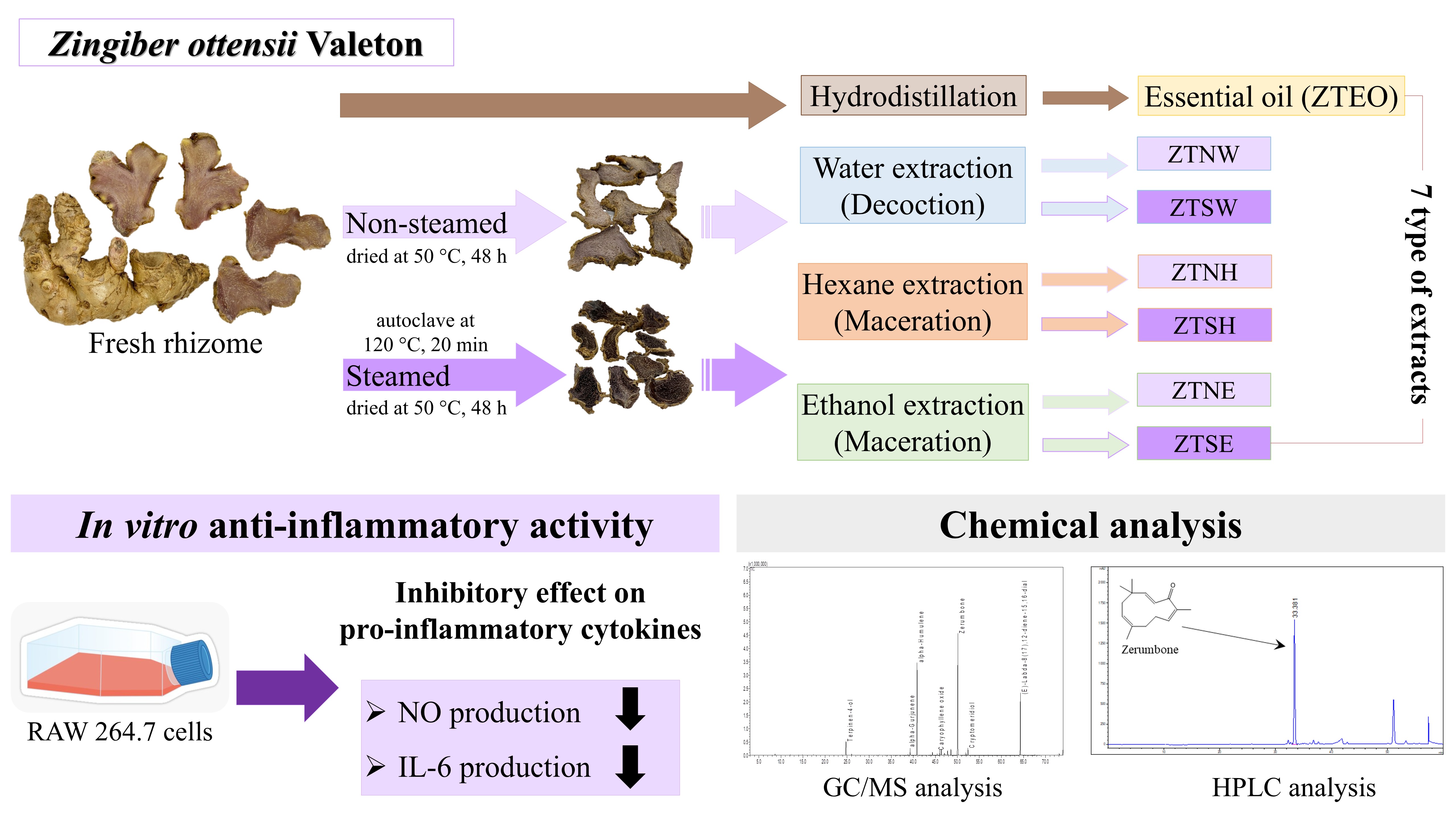The rhizome of Zingiber ottensii Valeton (ZT) has traditionally been used to treat wounds and various digestive disorders, including flatulence, stomachache, and peptic ulcers, as well as to alleviate inflammatory conditions. However, the impact of the steaming process - commonly employed in Thai folk medicine to prepare ZT rhizomes - on their anti-inflammatory activity and chemical constituents has not yet been scientifically investigated. Therefore, this study aimed to compare the anti-inflammatory activities, analyze the chemical composition, and quantify bioactive constituents of essential oil, including steamed and non-steamed extracts. In vitro anti-inflammatory activities were assessed by measuring NO inhibition using Griess reagent in RAW 264.7 cells, as well as IL-6, TNF-α and PGE2 production using an ELISA test kit. Chemical composition was analyzed using GC/MS, and bioactive constituents in the extracts were quantified by HPLC. Among all ZT extracts, the essential oil (ZTEO) exhibited the strongest inhibitory effect on NO and IL-6 production. In comparison, the non-steamed hexane (ZTNH) and ethanol (ZTNE) extracts were significantly more effective than the steamed hexane (ZTSH) and ethanol (ZTSE) extracts in suppressing these inflammatory mediators. Zerumbone also demonstrated remarkable efficacy in inhibiting NO and IL-6, being at least 57-fold more potent than diclofenac. GC-MS analysis revealed notable differences in the chemical profiles of steamed and non-steamed ZT extracts and essential oil. Zerumbone and α-humulene were identified as the major sesquiterpenes in all tested samples, while terpinen-4-ol was absent in both the steamed hexane and ethanol extracts. The HPLC results further confirmed a significant decrease in zerumbone content in the steamed extracts compared to their non-steamed counterparts. Overall, the steaming process appeared to reduce both the anti-inflammatory activity and zerumbone content of Zingiber ottensii rhizomes, suggesting that non-steamed rhizomes are preferable for preserving their bioactive compounds and therapeutic potential.
