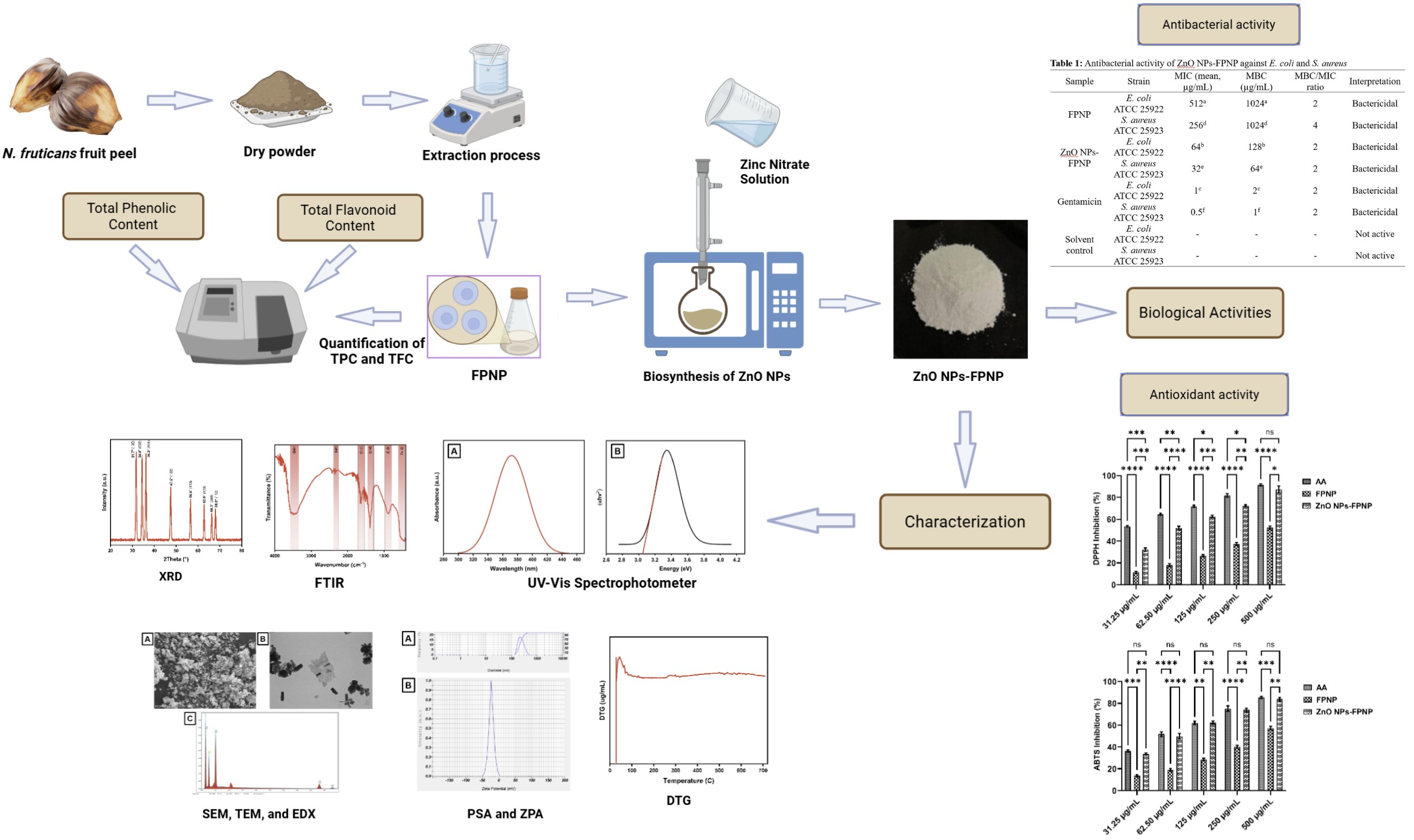 Nanostructured particles exhibit broad applicability in nanotechnology-related fields, with their properties strongly influenced by the synthesis method and material source. This study reports an eco-friendly, microwave-assisted approach for synthesizing zinc oxide nanoparticles (ZnO NPs) using Nypa fruticans fruit peel extract (FPNP). The quantification of the total phenolic (TPC) and flavonoid content (TFC) of FPNP was determined using a calorimetric assay. Whereas, the biosynthesis of ZnO NPs-FPNP was characterized with several instrumental methods, including UV-Vis spectrophotometer, Fourier transform infrared spectroscopy (FT-IR), particle size and zeta potential analyzer (PSA and ZPA), scanning electron microscopy (SEM), transmission electron microscopy (TEM), energy-dispersive X-ray spectroscopy (EDX), x-ray diffraction (XRD), and thermogravimetric analysis (TGA). Therefore, the antioxidant and antibacterial activities of ZnO NPs-FPNP were observed to evaluate the biological activity of nanoparticles. Furthermore, the FPNP contains TPC and TFC were 20.53 ± 1.20 mg GAE/g and 15.80 ± 1.46 mg QE/g, respectively. Meanwhile, the ZnO NPs-FPNP was acquired as an amorphous yellowish-white powder, devoid of any discernible odour, and was comprehensively characterised. The visible spectra revealed a significant peak at 370 nm, correlating to a band gap energy of 3.04 eV, thus confirming the synthesis of the nanoparticles. FTIR spectra indicated that the peak at 497 cm−1 corresponds to the stretching vibration of Zn-O, which is the characteristic peak for the formation of ZnO NPs-FPNP. The particle size of ZnO NPs-FPNP, as determined by particle size analysis, is 234 ± 59.5 nm, with a polydispersity index of 0.516. The zeta potential of ZnO NPs-FPNP was measured at ‒25.7 ± 1.50 mV, signifying the stability of the ZnO NPs-FPNP. The SEM image displayed an uneven morphology, with primary particle sizes at the nanometre scale that tend to combine into micrometre clusters. TEM investigation revealed that ZnO NPs-FPNP predominantly exhibited a rod-like morphology, with lengths varying from approximately 50 to 150 nm and diameters between 20 and 40 nm. The ZnO NPs-FPNP were confirmed to comprise three elements: zinc, oxygen, and carbon. The XRD pattern confirmed that the ZnO NPs-FPNP have a wurtzite crystal structure, demonstrating significant stability at temperatures above 400 °C. This study exhibited that the no significant difference in the antioxidant activity to inhibit radical DPPH and ABTS between ascorbic acid and ZnO NPs-FPNP at the highest concentration. Then, the ZnO NPs-FPNP have demonstrated bactericidal effect against Escherichia coli and Staphylococcus aureus. Nonetheless, ZnO NPs-FPNP have potential applications in pharmaceuticals, cosmeceuticals, and agriculture.