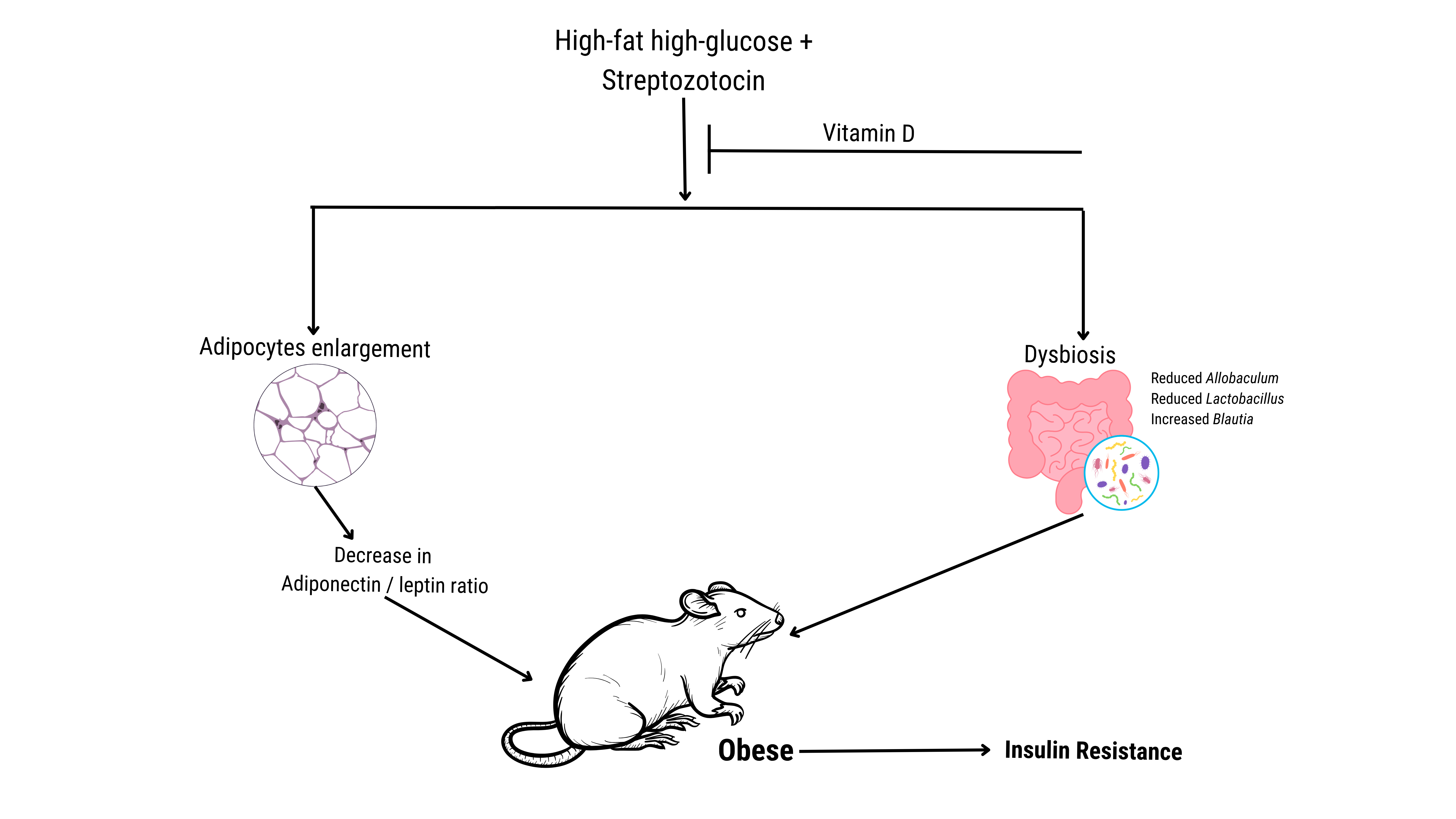 Obesity escalates the process of insulin resistance to type 2 diabetes. In our study, vitamin D3 supplementation reduced body weight in an insulin-resistant rat model induced by a high-fat, high-glucose diet and low-dose streptozotocin. The weight loss was accompanied by restored adipokine balance, an increased adiponectin/leptin ratio, decreased adipocyte size, and a shift in microbial composition including increased Lactobacillus and Allobaculum.