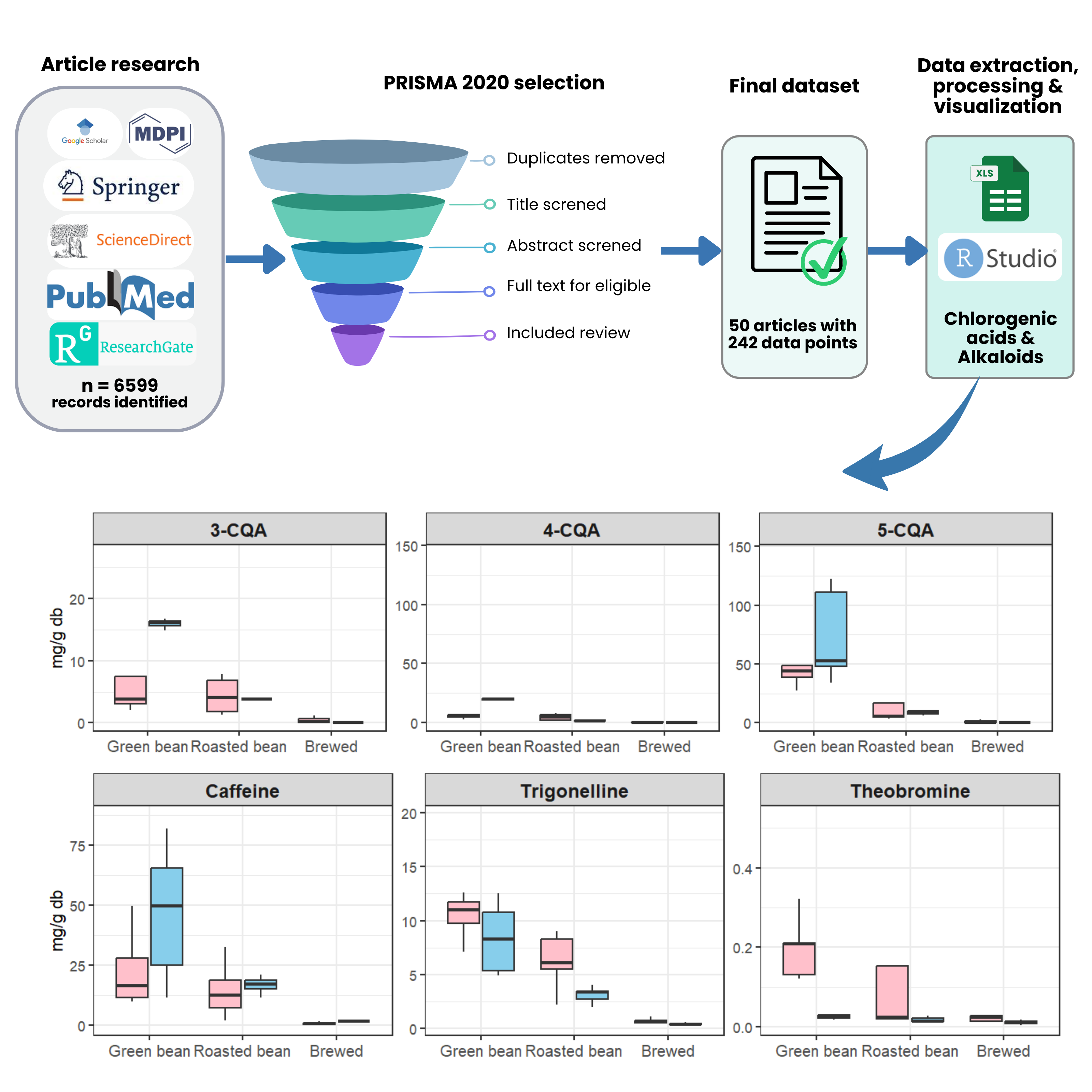 Coffee is one of the most consumed beverages worldwide, and its quality and health-related properties are strongly influenced by bioactive compounds such as chlorogenic acids (CQAs) and alkaloids (caffeine, trigonelline, theobromine). Their concentrations vary considerably depending on processing steps, including postharvest, roasting, and brewing. This systematic review, conducted following PRISMA 2020 guidelines, evaluated the stability and changes of CQAs and alkaloids in Arabica (Coffea arabica) and Robusta (Coffea canephora) across green beans, roasted beans, and brewed coffee. Articles were retrieved from multiple databases using specific keywords, and quantitative data were extracted and analyzed using Microsoft Excel and R Studio. Results showed that Arabica green beans contained 12.50 - 160.10 mg/g CQAs, which de-creased by up to 99% after roasting and brewing, while Robusta initially contained 32.10 - 185.60 mg/g with reductions of 56% - 92%. Caffeine was more stable, averaging 22.15 ± 15.22 mg/g in Arabica and 45.58 ± 22.14 mg/g in Robusta green beans, with moderate reductions through processing. Trigonelline consistently decreased by 80% - 94% in Ara-bica and 68% - 77% in Robusta, while theobromine remained at low levels with further reductions. Overall, roasting and brewing significantly degrade CQAs and trigonelline, while caffeine shows relative stability, providing insight into processing strategies that may optimize coffee’s bioactive profile.