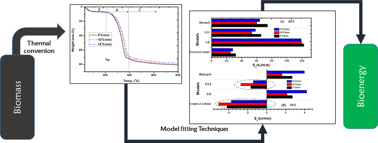 - Ginstling-Broushtein was found to be the best model for evaluating the kinetic parameters at the active pyrolysis zone as it had the highest R2 value