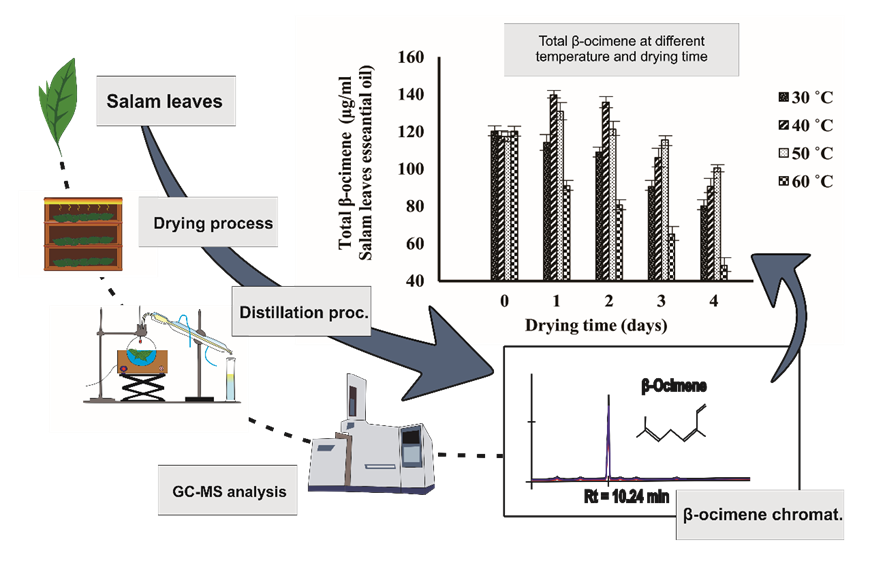 As a key volatile compound, the β-ocimene volatile compound in Salam leaves may change due to processing. Thus, this study aims to examine the effect of the drying process on the water activity, pH, total soluble protein values, 1-deoxy-D-xylulose-5-phosphate synthase, geranyl diphosphate synthase, and monoterpene synthase enzyme activities, and total β-ocimene due to variations in drying time (0, 1, 2, 3 and 4 days) and temperature (30, 40, 50 and 60 °C). The results showed that all parameters significantly decreased day by day, especially at higher temperatures. Meanwhile, for the temperatures of 40 and 50 °C, the enzyme activity parameters were increased until the 1st drying day. The drying process with a temperature of 40 °C gives the highest value of β-ocimene, reaching 139.62 µg/mL Salam leaves essential oil. These results were entirely satisfactory, and research conditions can be a reference for 4 days drying process of Salam leaves.